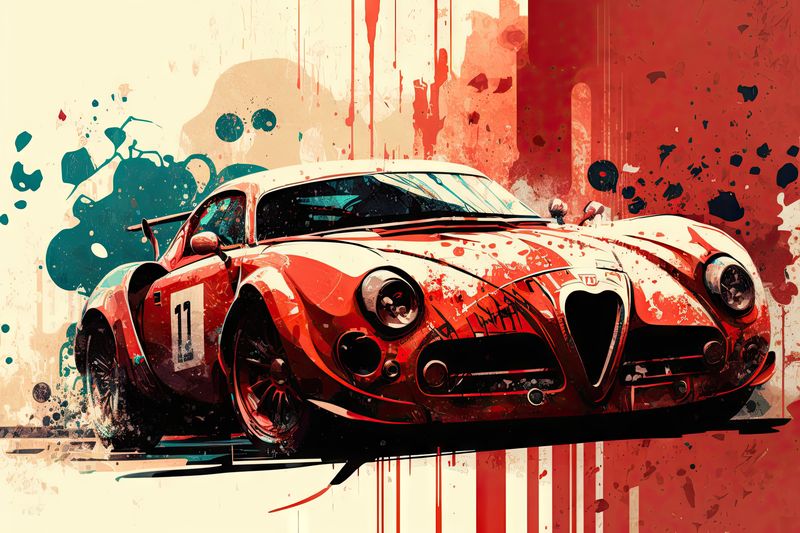 This illustration of the Alfa Romeo 8C Competizione is a true masterpiece of automotive art, showcasing the elegant and sporty design of this luxury car using the splash painting technique.