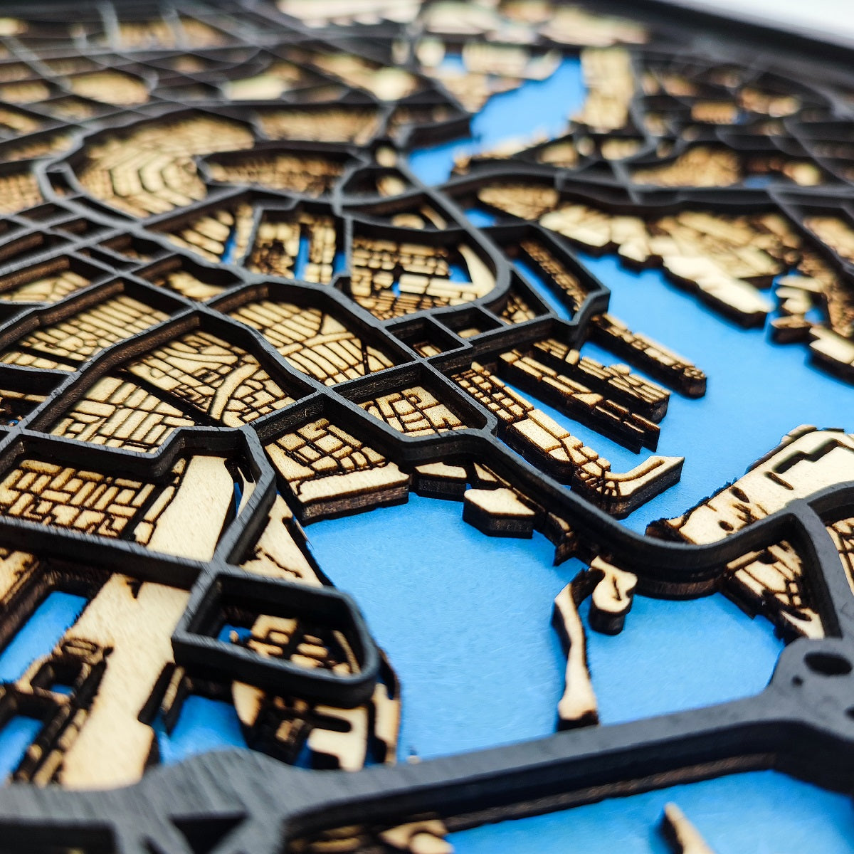 Discover the charm of unique decoration with this beautiful wooden map of Amsterdam. Handmade in France, this original piece will seduce you for sure. Made of three layers of FSC-certified wood, 3 mm each, this relief map highlights the main roads of the city, painted in black, while the secondary roads are engraved on the second layer. The waterways are cut out to reveal a third layer painted blue, adding a refreshing pop of color.