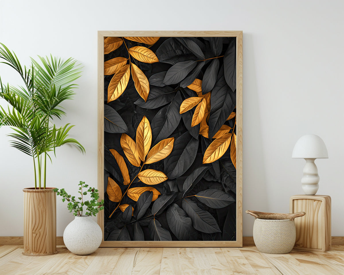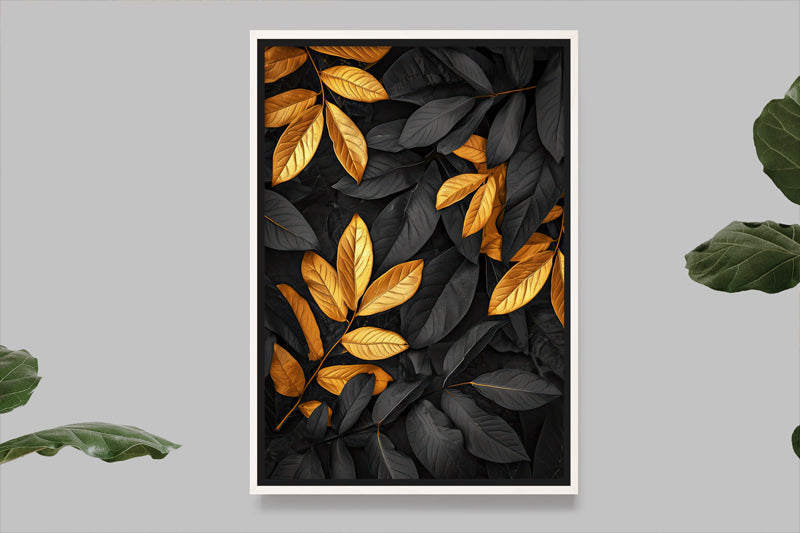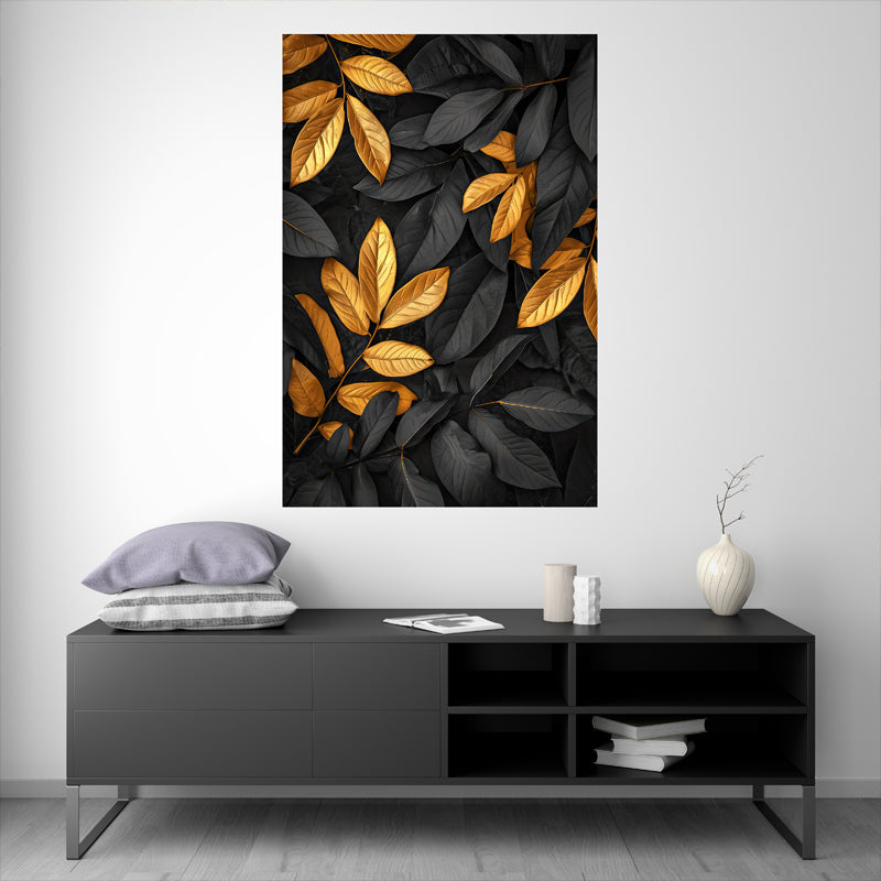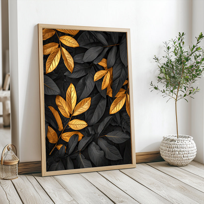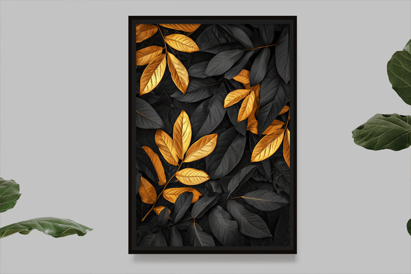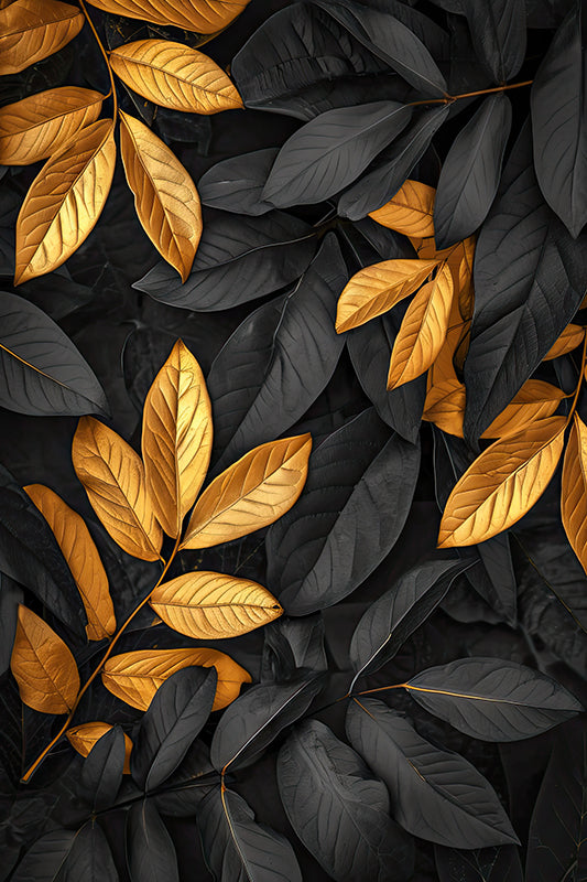 Les feuilles d'automne en or vibrant et noir profond forment un motif naturel saisissant, mettant en valeur la beauté saisonnière dans des détails rapprochés.