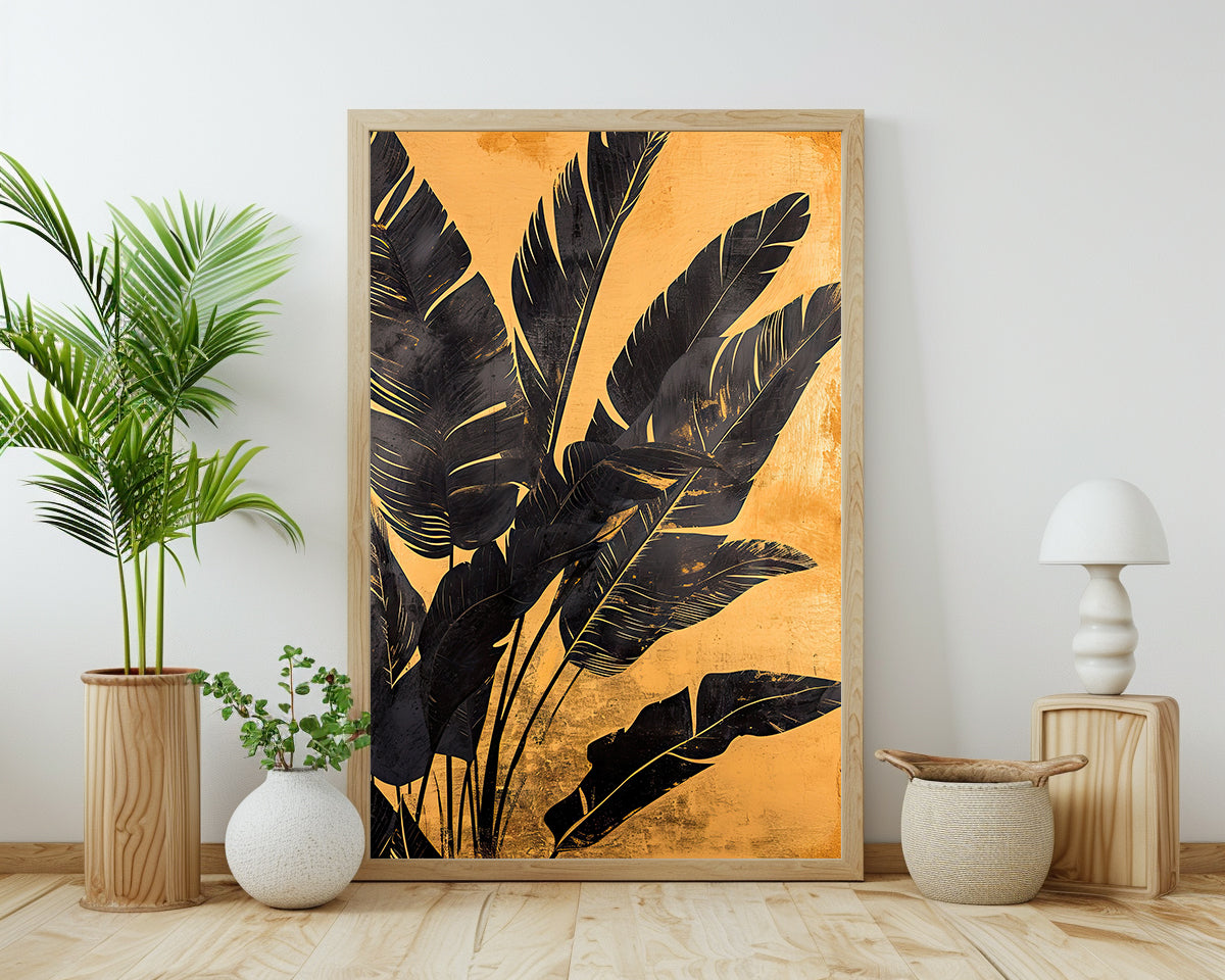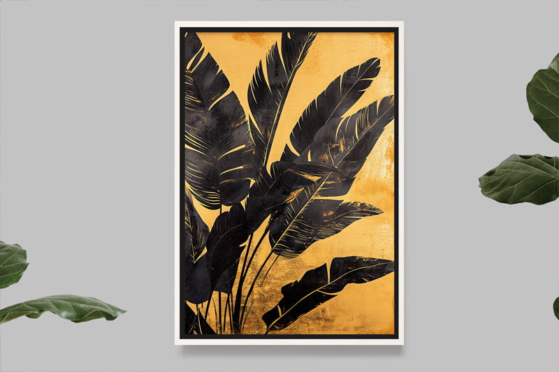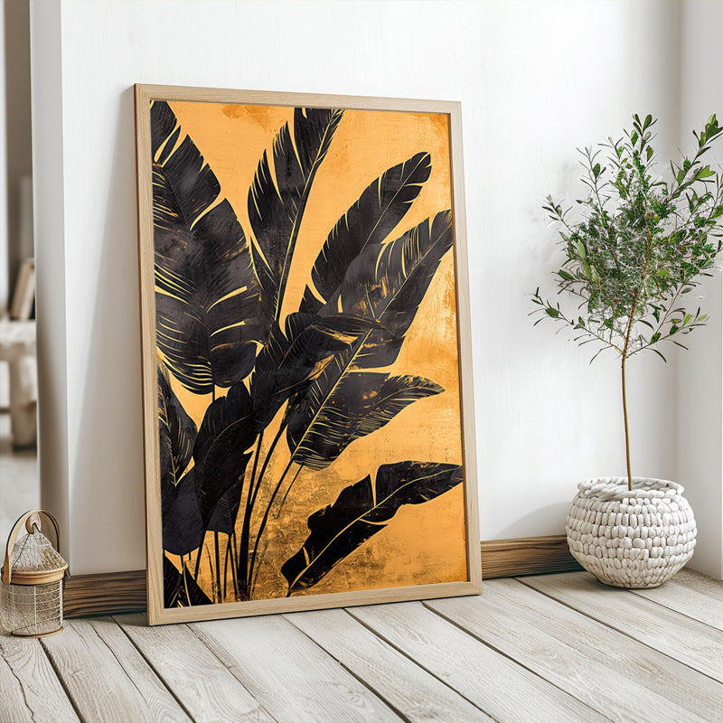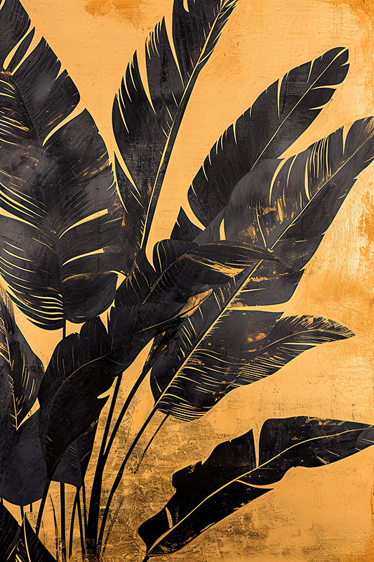 Une œuvre d'art vibrante met en scène de grandes feuilles tropicales noires sur un fond doré chaleureux. Ce design saisissant apporte une touche d'élégance et de sophistication à tout espace de vie.