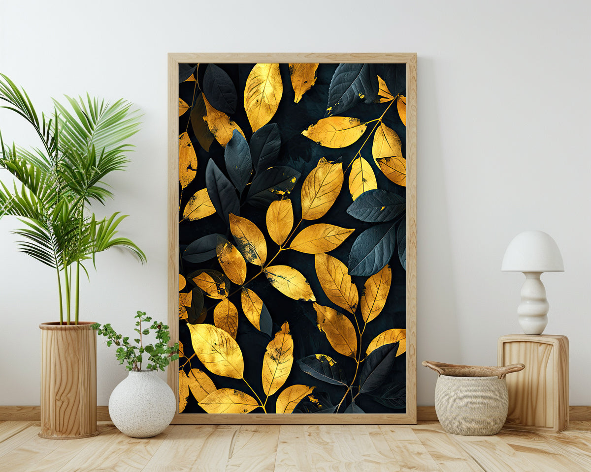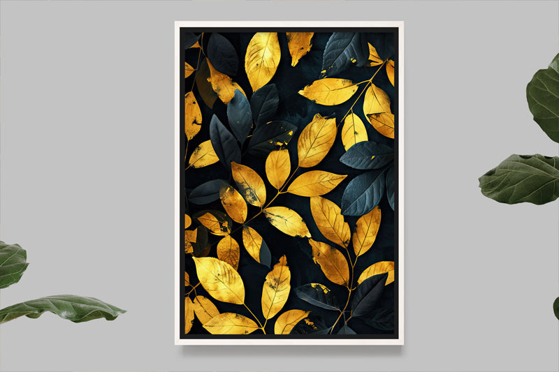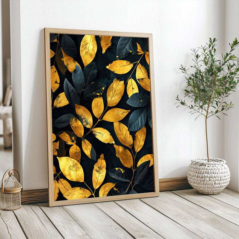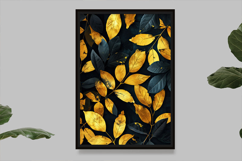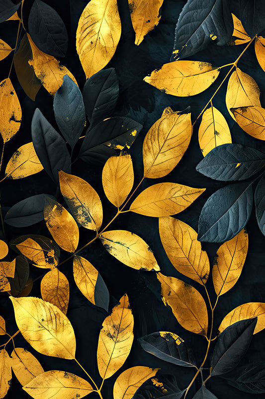 Une collection de feuilles dorées vibrantes mêlées à un feuillage plus sombre crée un affichage visuel saisissant. Cette œuvre met en valeur les couleurs riches de l'automne et la transition de la nature.