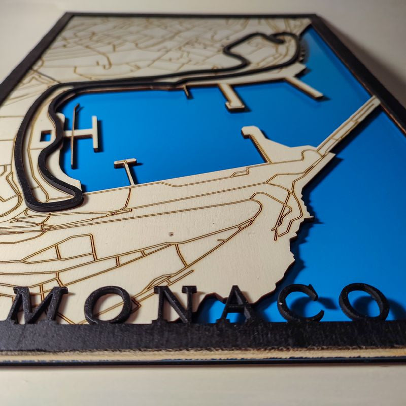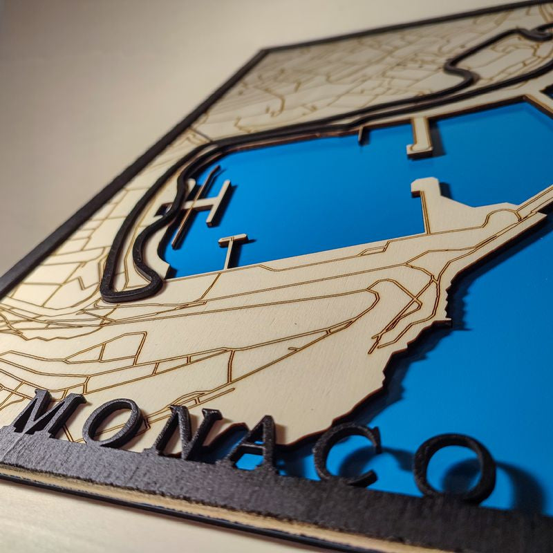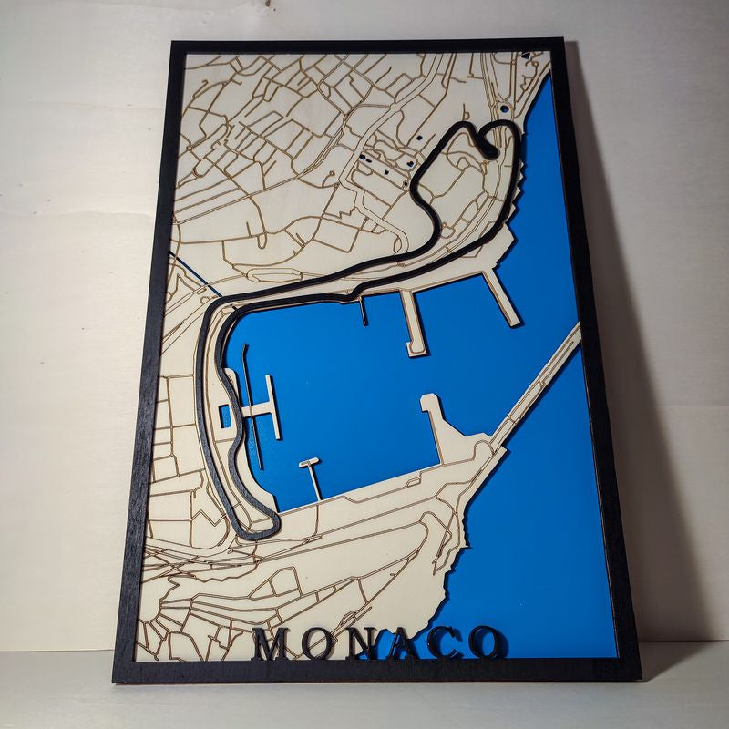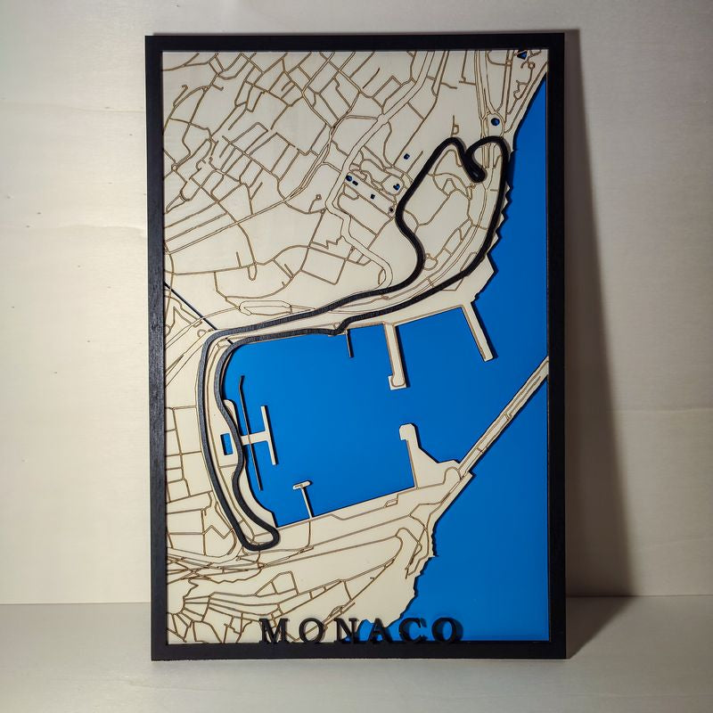 Find in a most original version, the famous circuit of Monaco, located in the middle of the city. The unique and artistic 3D multilayer wooden map of your favorite French racetrack. The race track and the frame are hand painted in black.