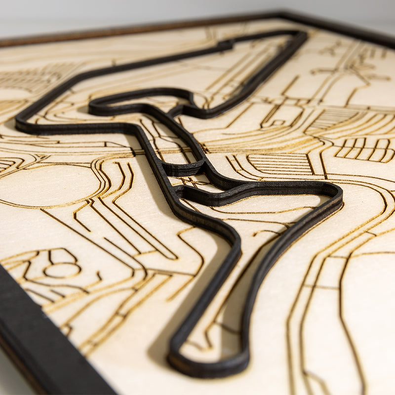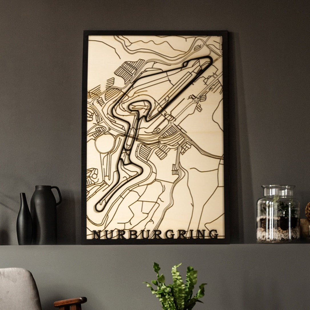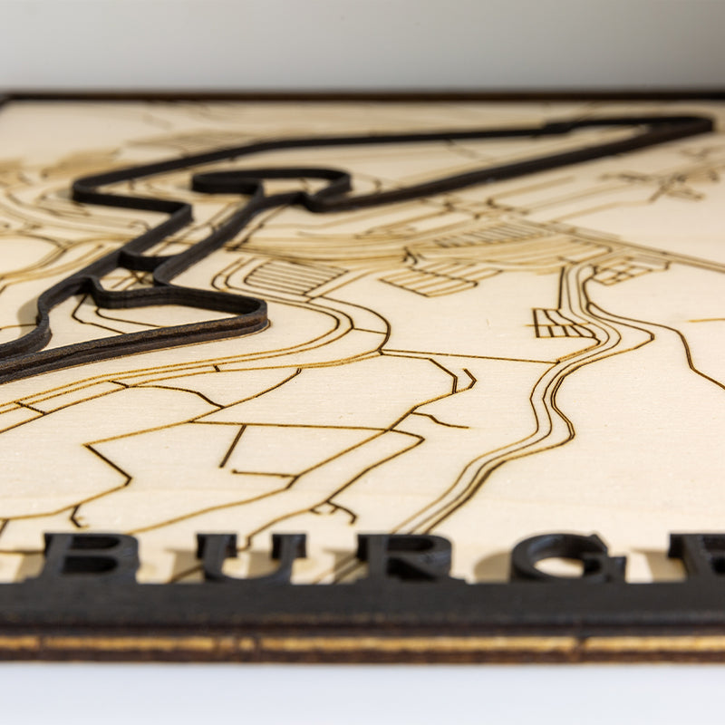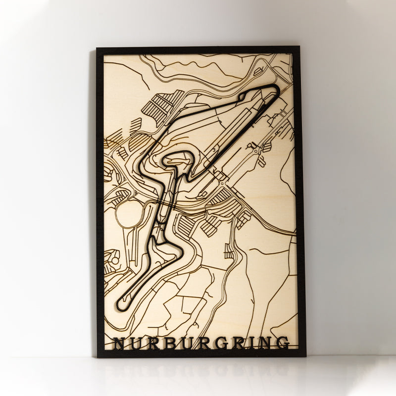 Find in a most original version, the famous circuit of Nurburgring, the German nordschleife. The unique and artistic 3D wooden map of your favorite German race track. The race track and the frame are hand painted in black.