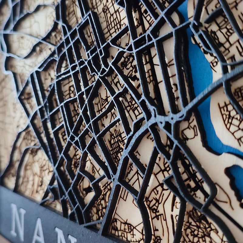 Each card is made of three layers of 3mm thick wood. The main roads of the city are painted black on the first layer, while the secondary roads are engraved on the second layer. The streams are cut out to reveal the third layer, which is painted blue for a striking effect.
