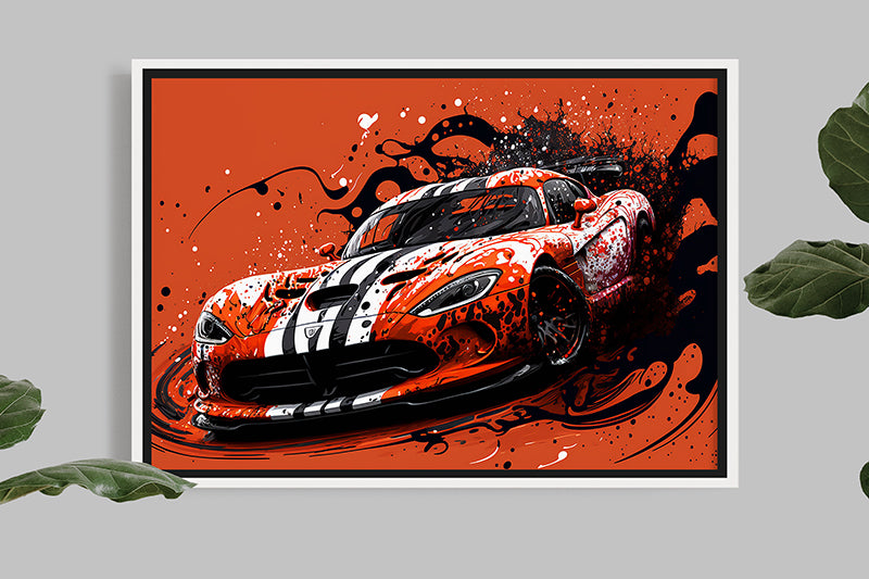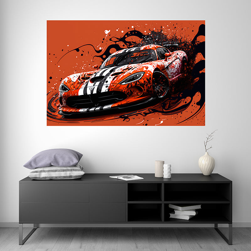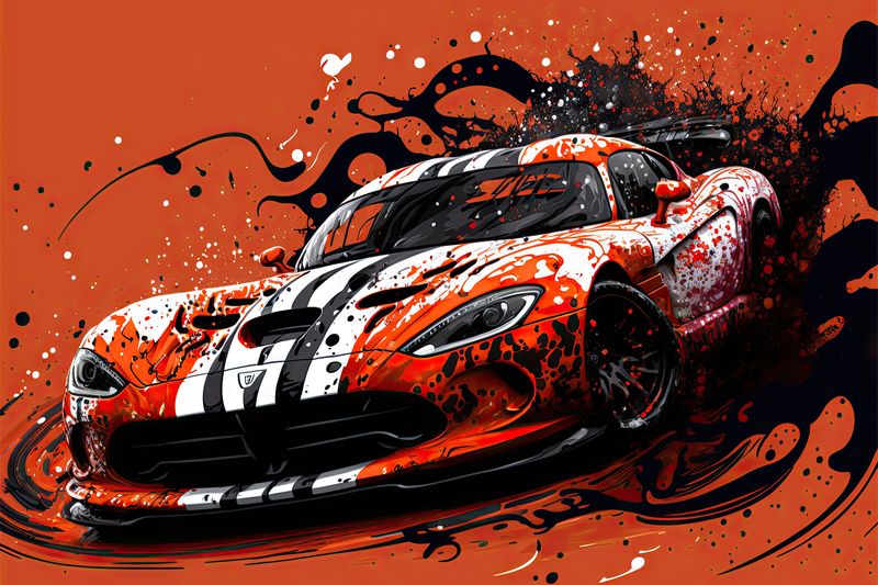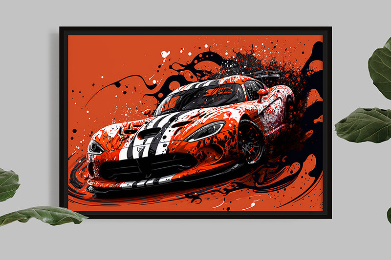 This illustration of the legendary Dodge Viper in splash painting is a must-have for all fans of sports cars and bold design. The vibrant orange-red hue and splashes of colorful paint add a whimsical and modern touch to this already iconic car. This artwork will be a perfect addition to your dream car collection or just to decorate your workspace or living room. Don't hesitate to add this unique piece to your range of automotive decoration!