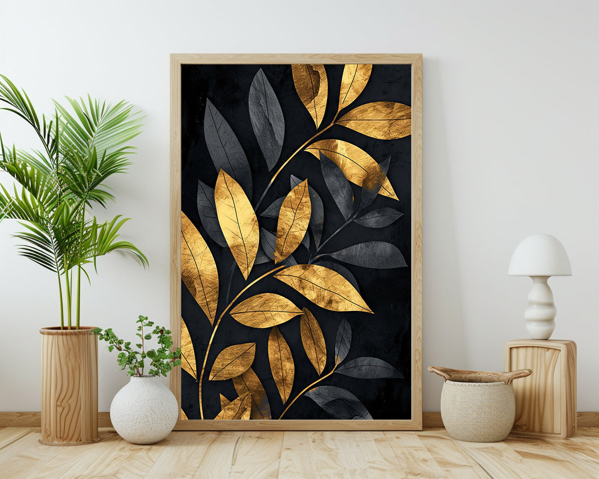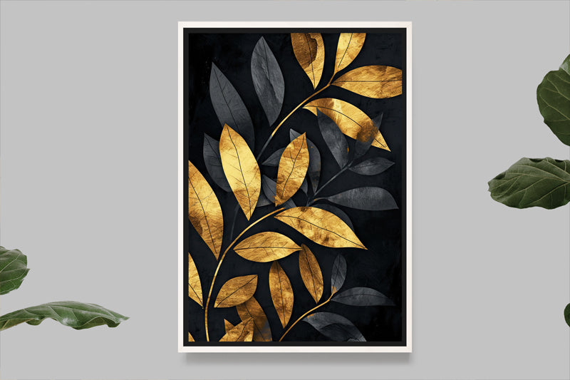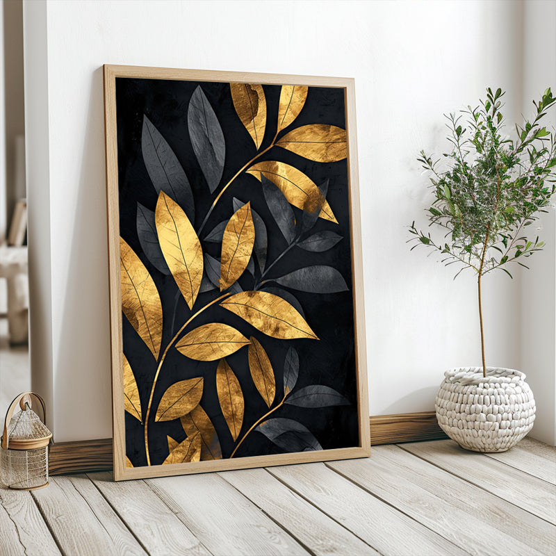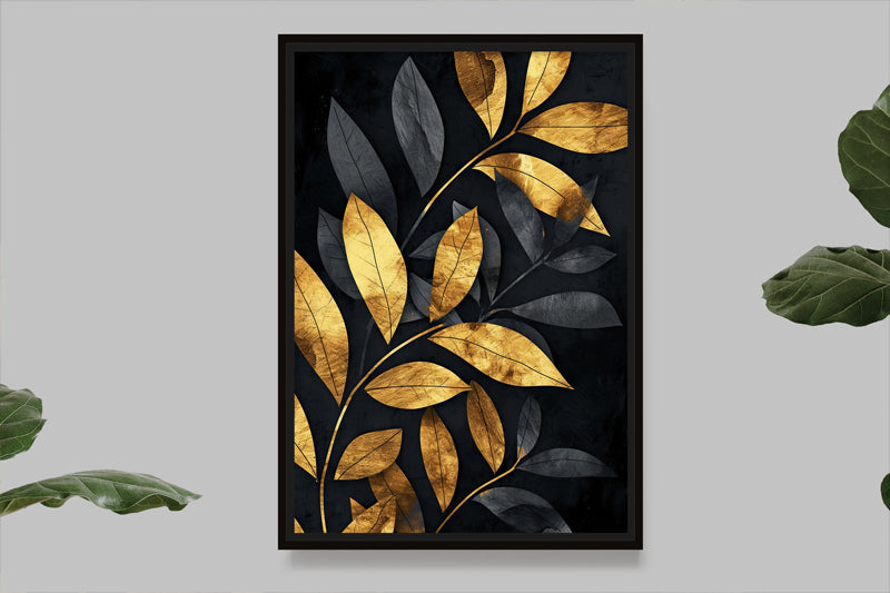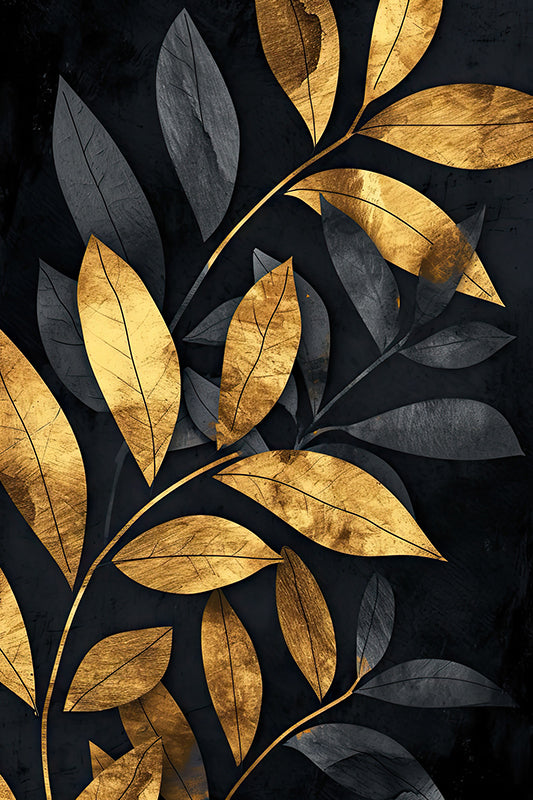 Un agencement saisissant de feuilles noires et dorées s'étend sur un fond sombre, créant un visuel élégant et sophistiqué, parfait pour des thèmes de décoration contemporaine.