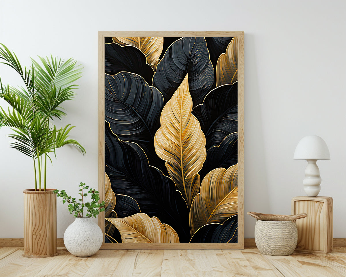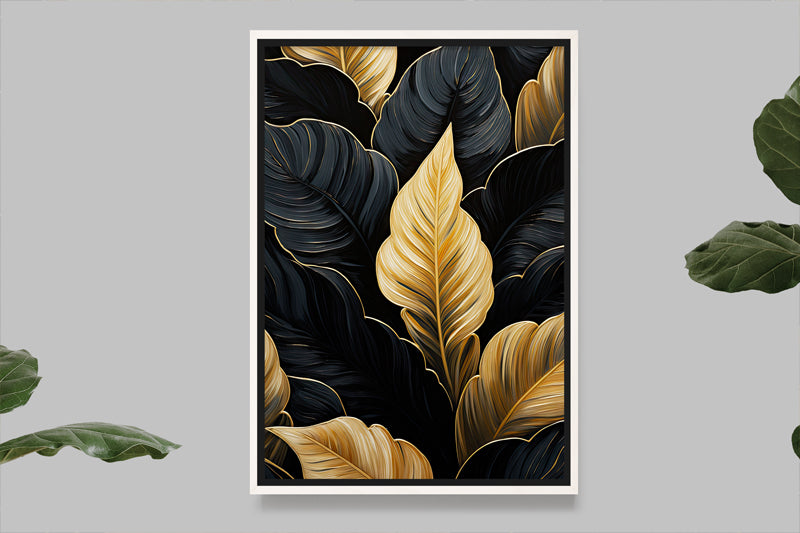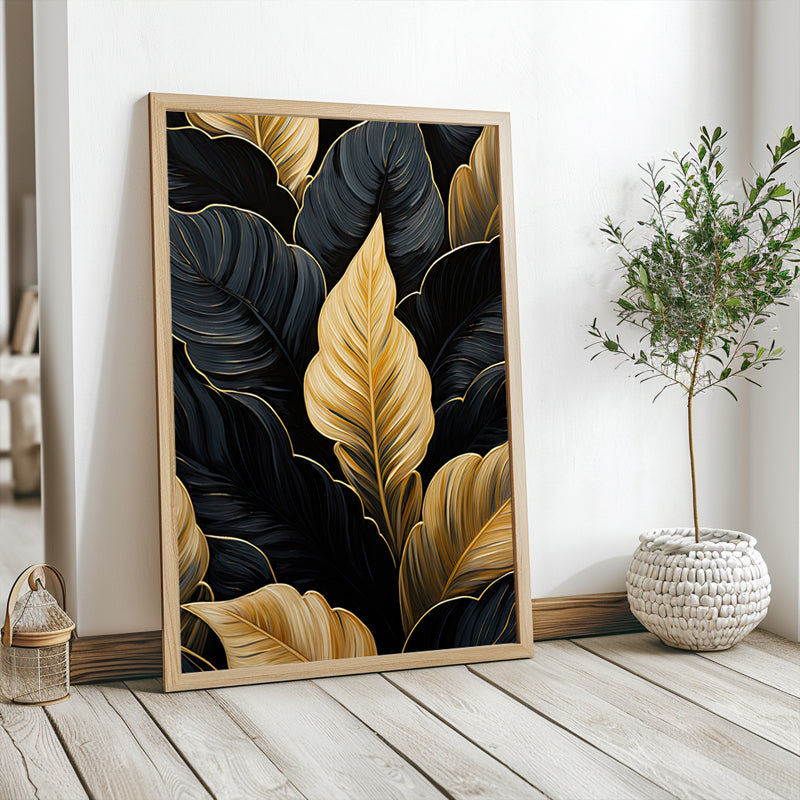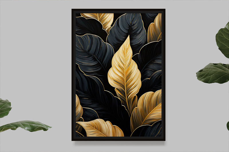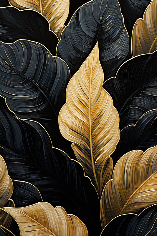 Un agencement saisissant de feuilles noires et dorées s'étend sur un fond sombre, créant un visuel élégant et sophistiqué, parfait pour des thèmes de décoration contemporaine.