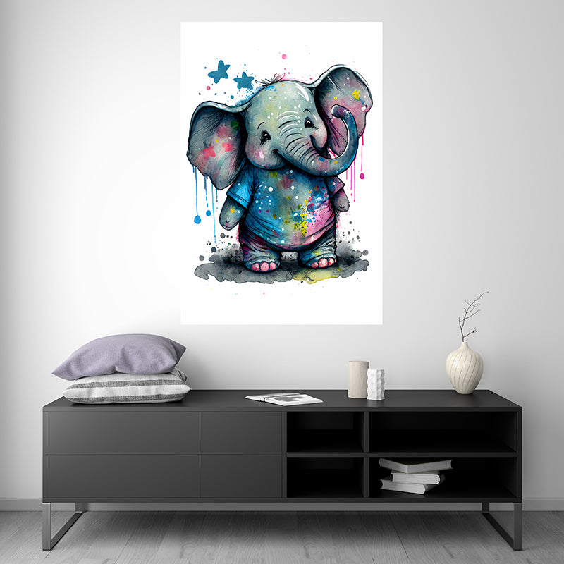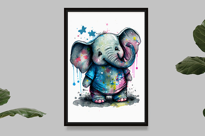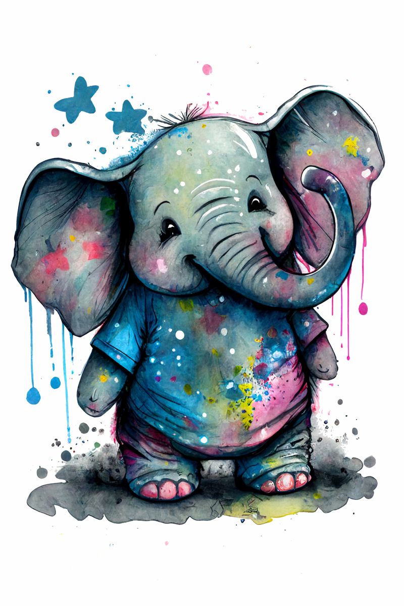 Here is an adorable illustration of a baby elephant in splash paint style. This little animal is full of life and tenderness, with its trunk waving happily and its large round eyes shining with curiosity. His smooth gray skin is dotted with small colored spots that give him a unique and lively look. This illustration is perfect for decorating a child's room or adding a soft and cheerful touch to any space. So don't hesitate, treat yourself to this cute and charming baby elephant!