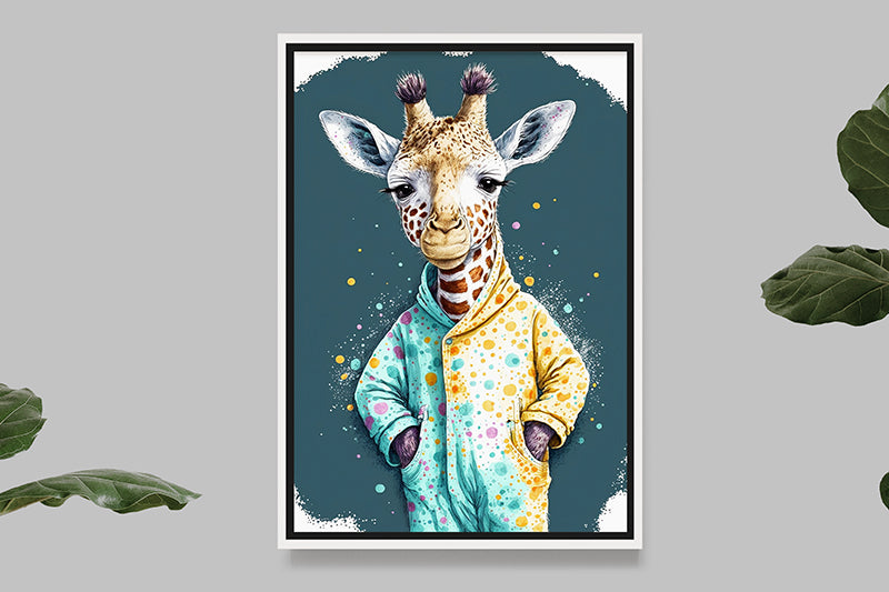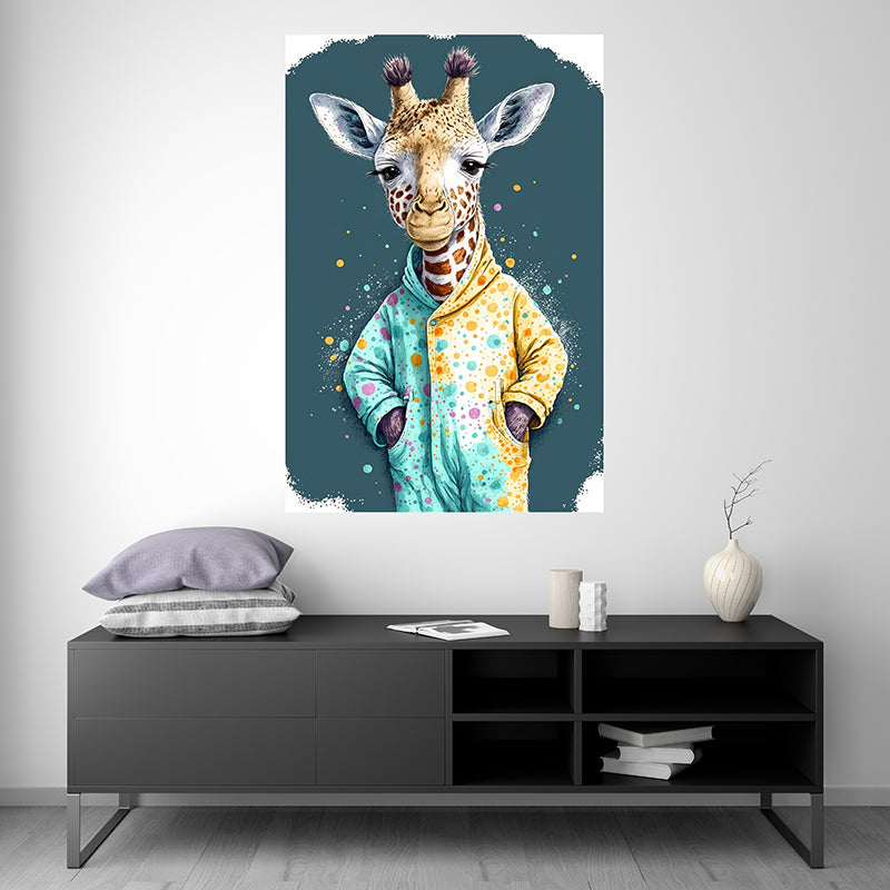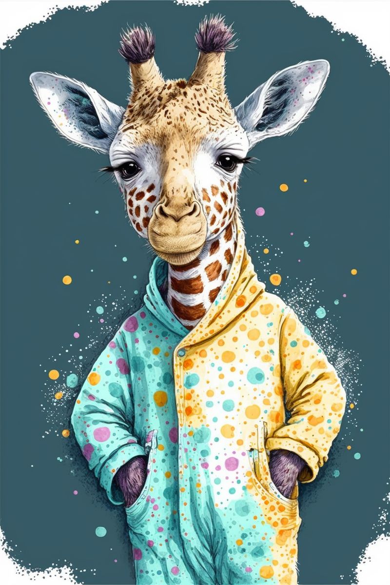 Here is a unique and colorful illustration of a cute giraffe in a splash painting style. This colorful work of art will bring a touch of life and cheer to any space. With its smiling face and colorful spots, this giraffe will immediately put you in a good mood. This illustration would be perfect for decorating a child's room or adding a splash of color to an empty white wall. Treat yourself to this original work of art and add a touch of cheerfulness to your home.