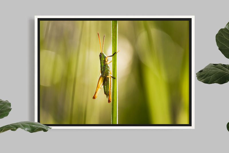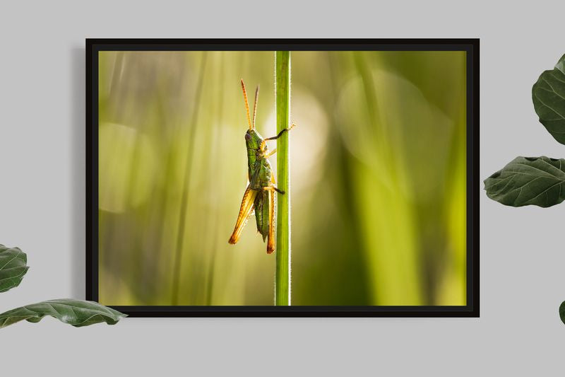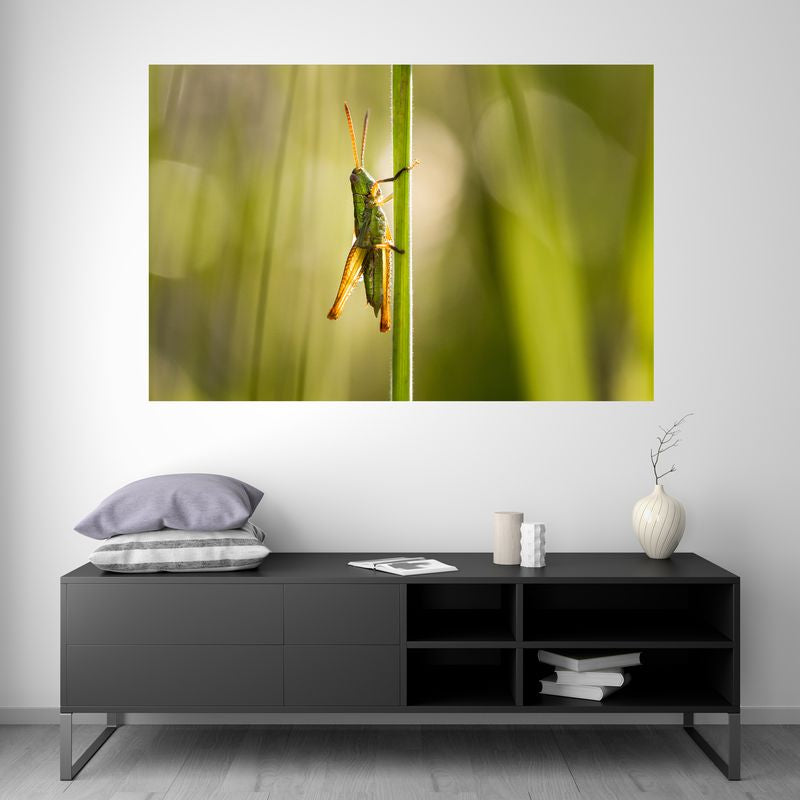 This captivating photo shows a grasshopper among tall grass. The bright green of the insect stands out against the background of greenery, creating a fresh and natural image. The photo composition showcases the grasshopper's grace and poise, while the image quality is outstanding, with crisp detail and vibrant color.