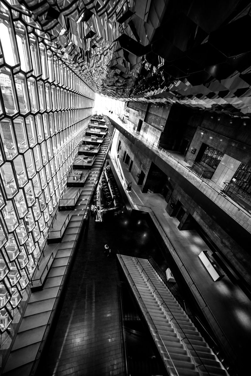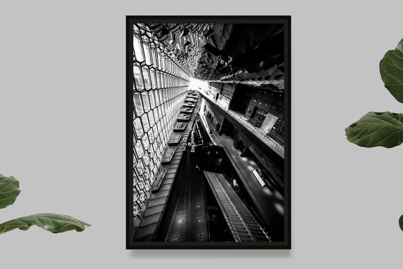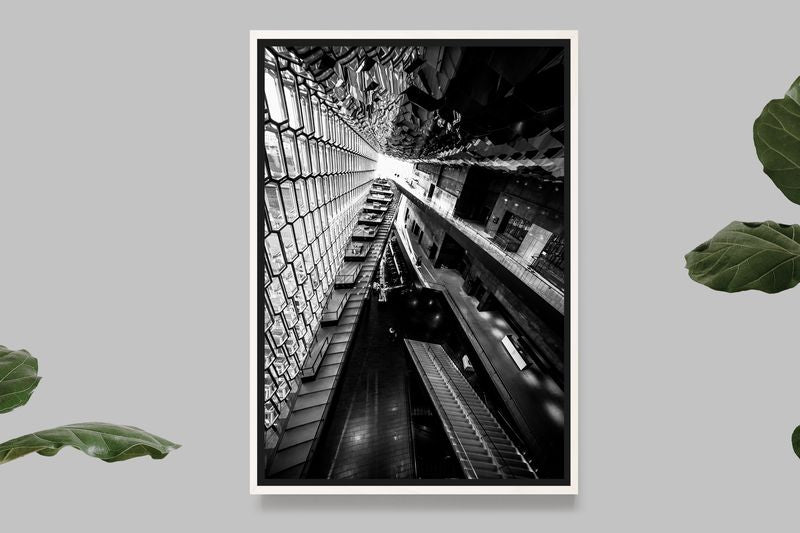 Treat yourself to a unique photograph of the famous Harpa building in Iceland, captured in black and white to highlight its lines and architectural details. The Harpa, located in Reykjavik, is an iconic building in the city, known for its colored glass facade and elegant lines. This black and white photograph highlights the lines of the building and the bold design.