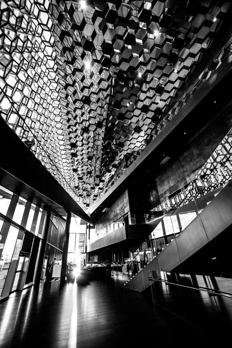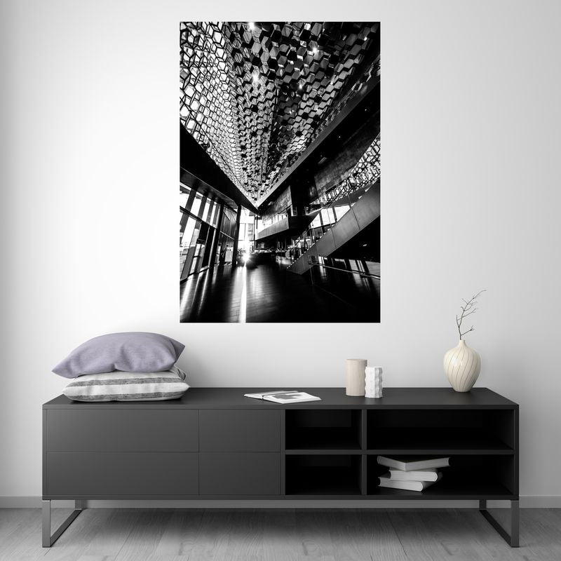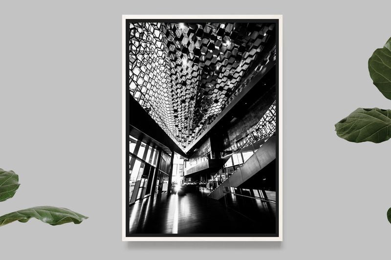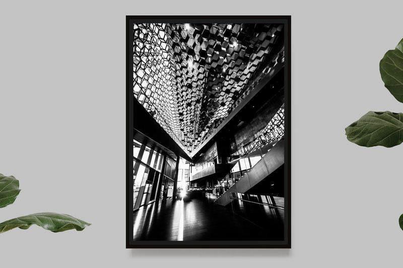Treat yourself to a unique photograph of the famous Harpa building in Iceland, captured in black and white to highlight its lines and architectural details. The Harpa, located in Reykjavik, is an iconic building in the city, known for its colored glass facade and elegant lines. This black and white photograph highlights the lines of the building and the bold design.
