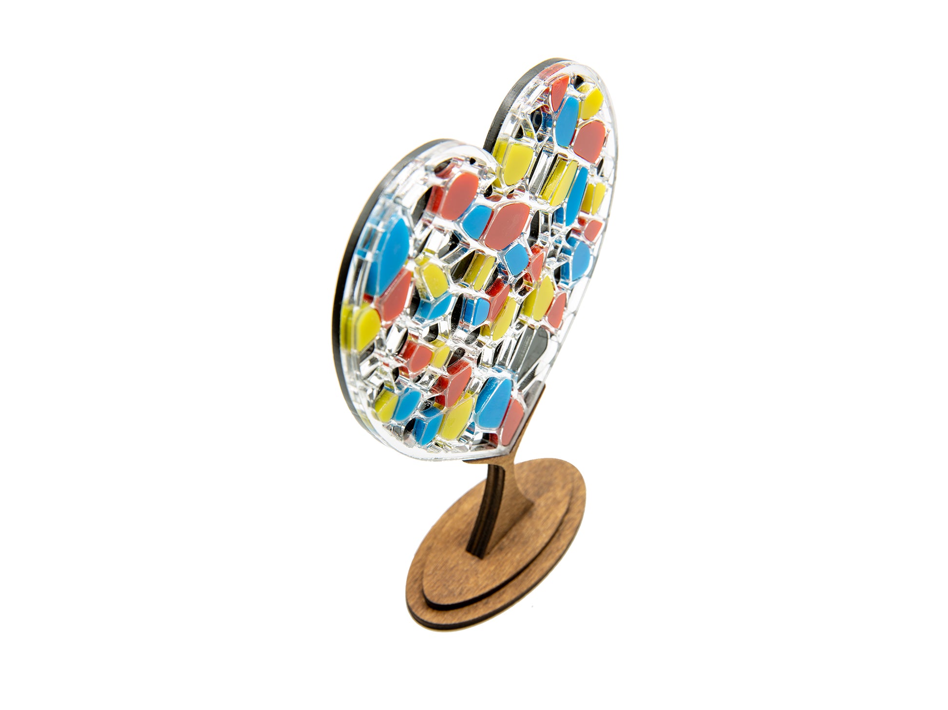 This 15x12 cm wood and acrylic sculpture captures the delicate essence of the symbol of love in the distinctive style of Dutch painter Piet Mondrian. Carefully carved wood serves as a support, embracing the universal symbolic shape of the heart, while the colored acrylic surfaces reflect Mondrian's characteristic aesthetic.