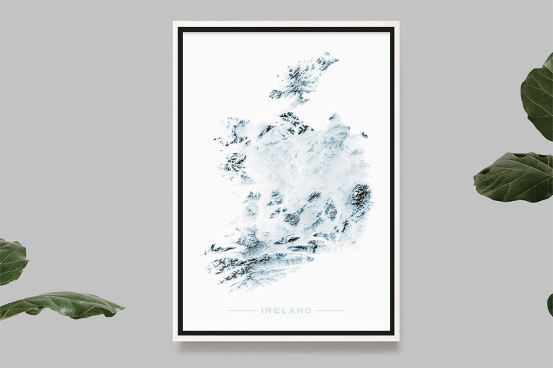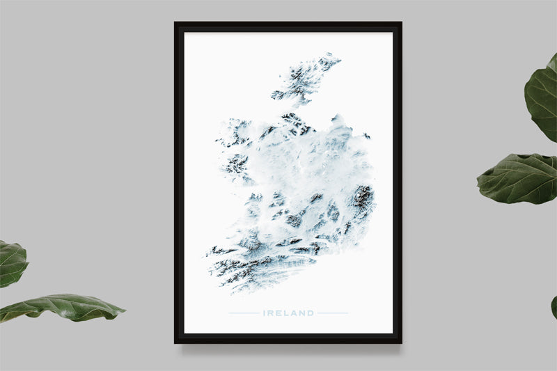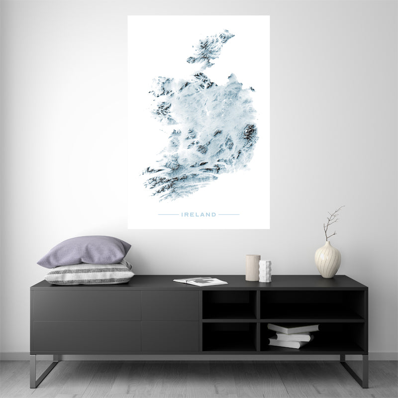 The blue gradient used to represent the reliefs brings a touch of color and freshness to the illustration, while the precise details of the map make it an ideal tool for travelers or anyone interested in Ireland.