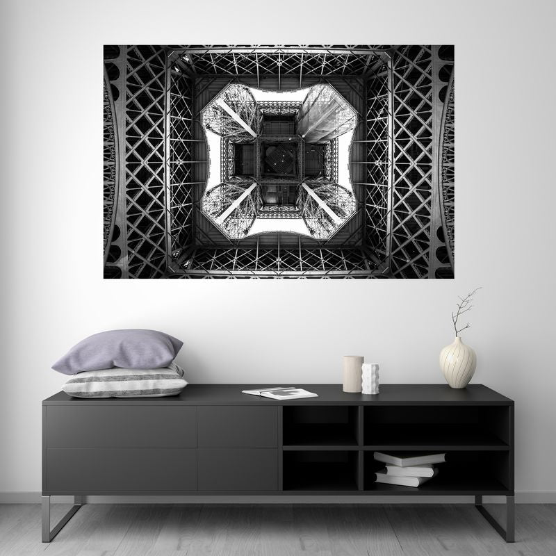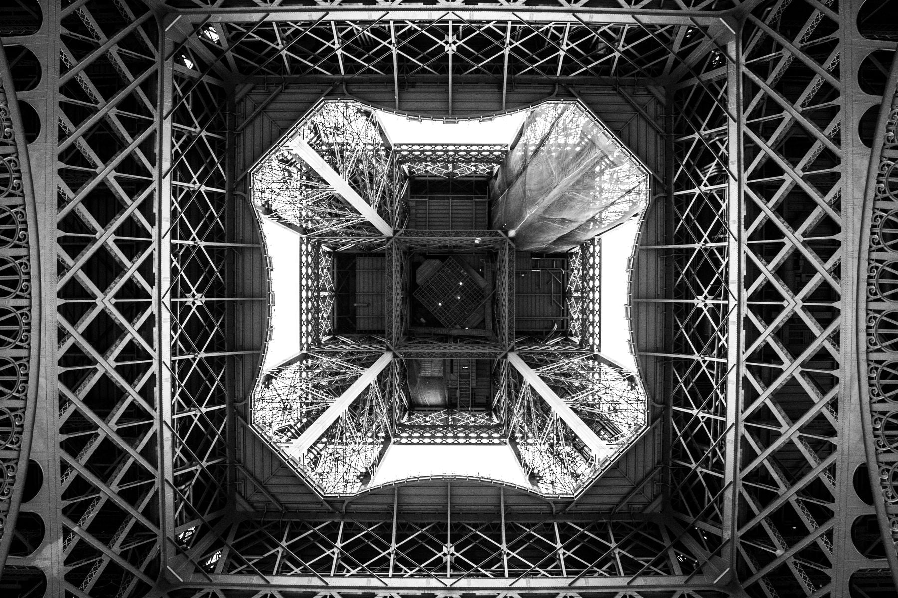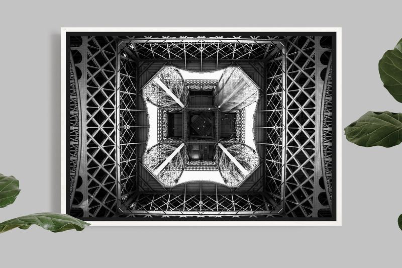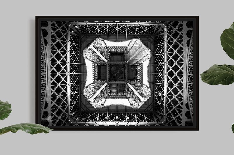 This black and white photo of the Eiffel Tower seen from below is simply spectacular. Captured from an original and unexpected angle, this image gives you a unique view of one of the most famous structures in the world. The contrast between shadows and lights highlights the architectural details of the Eiffel Tower, while the low-angle shot adds a dramatic dimension to the whole.