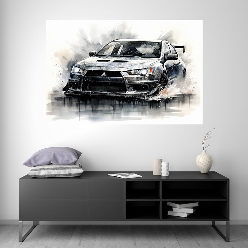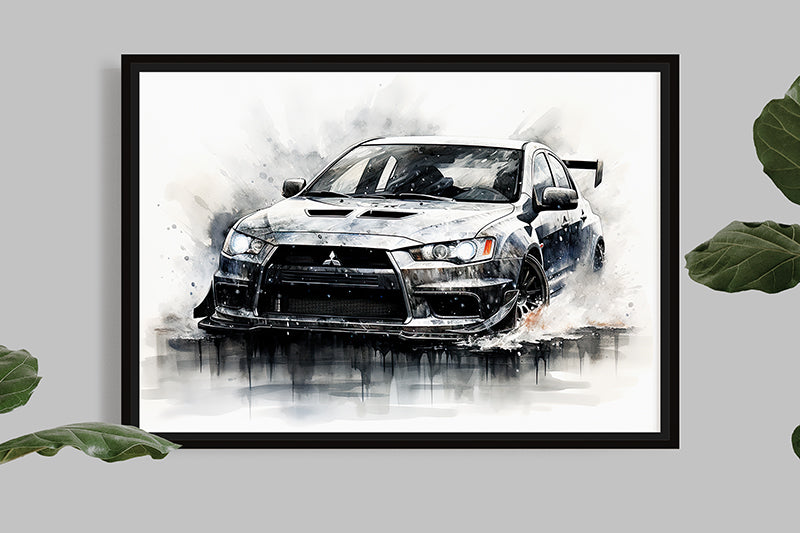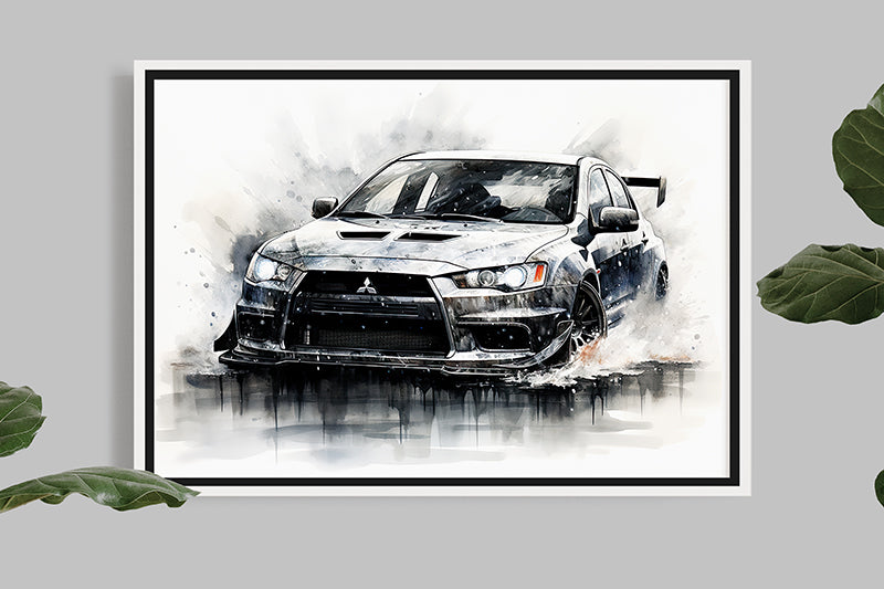 Don't miss this opportunity to own a unique and stunning illustration of the Mitsubishi Lancer Evolution in splash painting. You will be enchanted by this fusion of artistry and automotive excellence, celebrating the timeless beauty of one of the most iconic cars in modern automotive history.