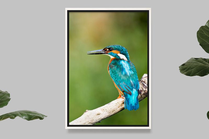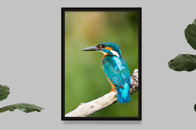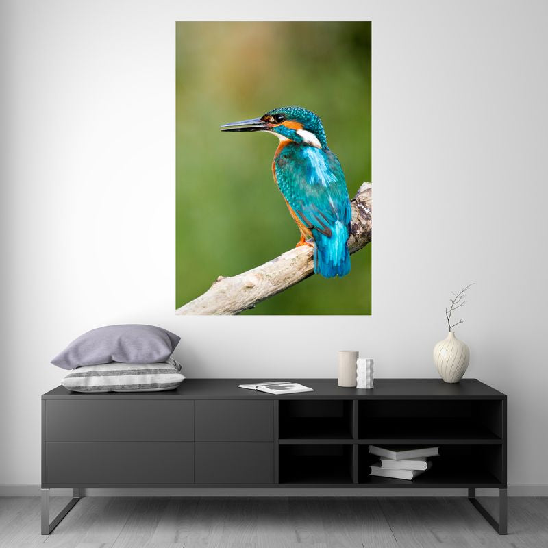 Here is a great shot of a kingfisher perched on a branch. This magnificent bird is captured in all its grace and beauty, with vibrant colors and a piercing gaze. The composition of the photo is perfect, highlighting the details of the bird and its environment. It would be a perfect addition to any bird photo collection or just a fascinating decoration for your home. Do not hesitate to take advantage of it now!