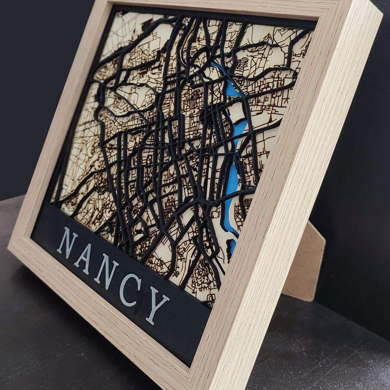 This nice 3D map of Nancy is made of 3 layers of wood of 3mm each. The main roads of the city are painted in black, the secondary roads are engraved on the second layer and the waterways are cut out to show the third layer painted in blue.