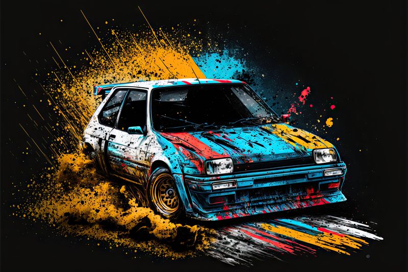 This illustration of the Renault Super 5 GT Turbo is a true masterpiece of automotive art, showcasing the sporty and iconic design of this iconic car through the splash painting technique.