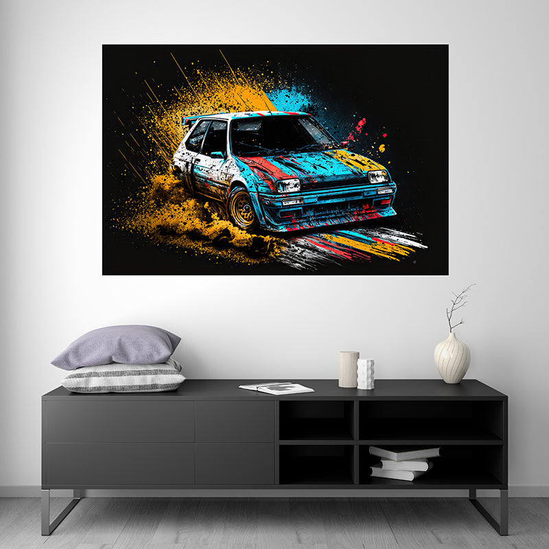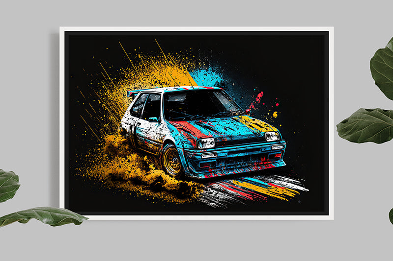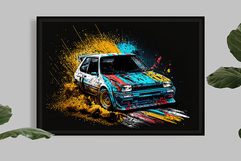 Don't miss this opportunity to own a unique and stunning illustration of the Renault Super 5 GT Turbo in splash painting. You won't be disappointed with this fusion of artistry and automotive excellence, celebrating the captivating beauty of one of Renault's most iconic cars and of 1980s automotive history.