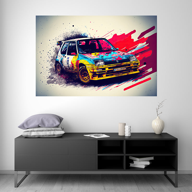 Don't miss this opportunity to own a unique and stunning illustration of the Renault Super 5 GT Turbo in splash painting. You won't be disappointed with this fusion of artistry and automotive excellence, celebrating the captivating beauty of one of Renault's most iconic cars and of 1980s automotive history.