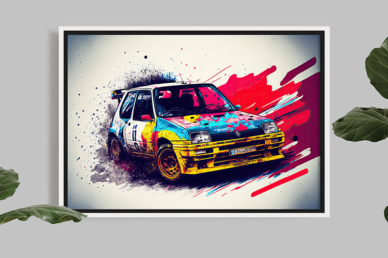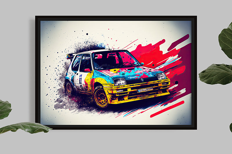 This illustration of the Renault Super 5 GT Turbo is a true masterpiece of automotive art, showcasing the sporty and iconic design of this iconic car through the splash painting technique.