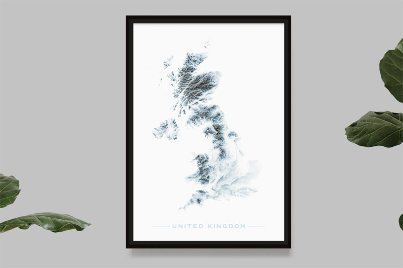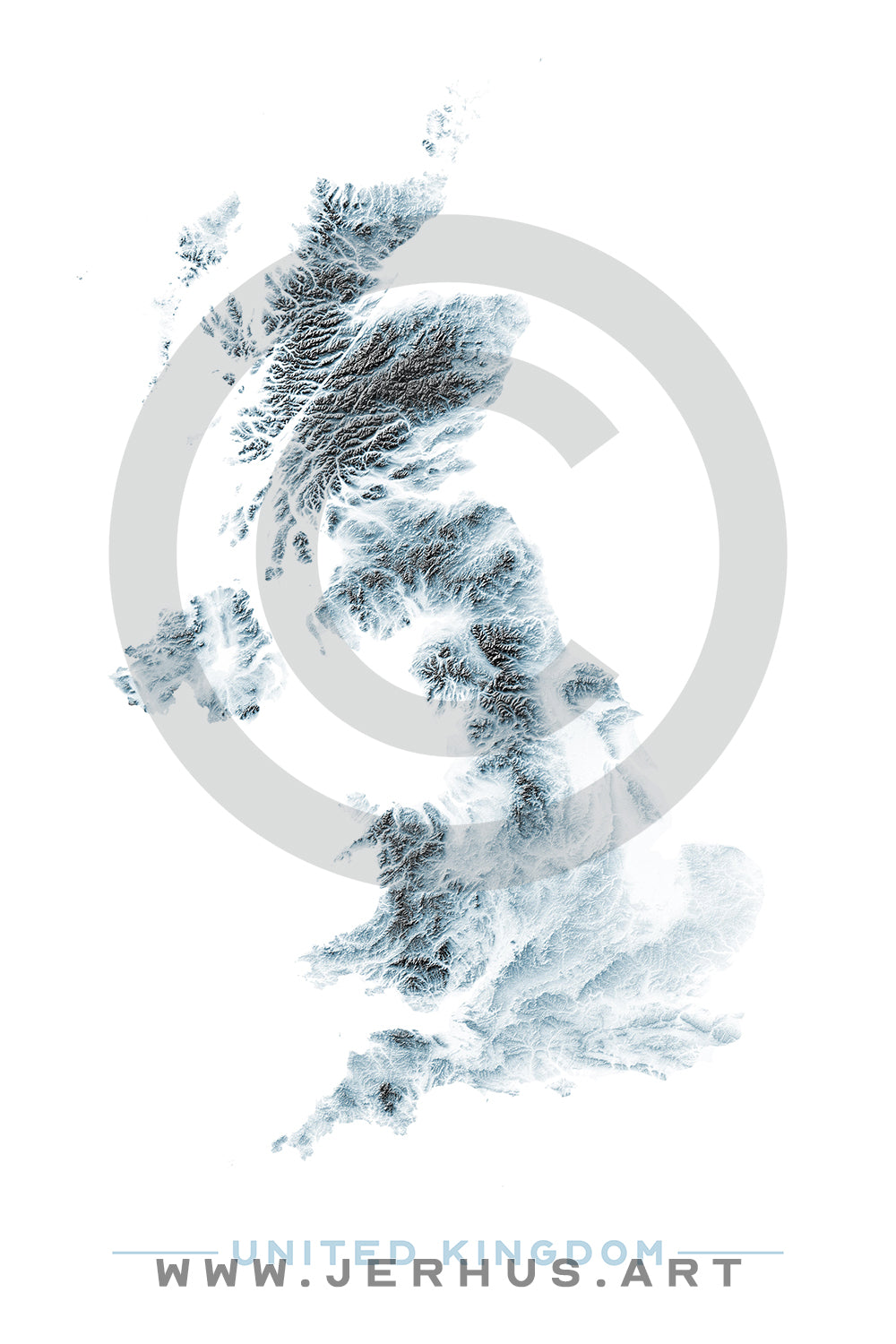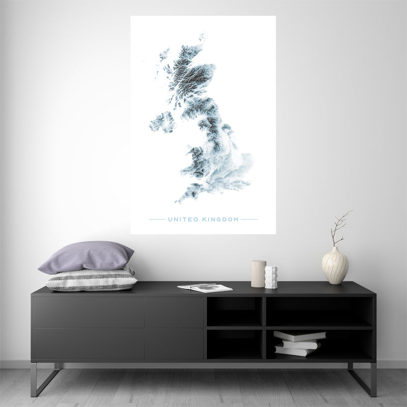 Here is a wonderful illustration of the UK relief map in blue color. With its mountains and valleys in relief, this map is perfect for all lovers of geography and travel. You will be able to admire the smallest details of each region of the country, including the islands. The blue color gives a touch of freshness and depth to the image, which makes it even more attractive. This artwork will be a stylish and modern addition to any wall or workspace. Don't miss this opportunity to own a unique piece from the UK.