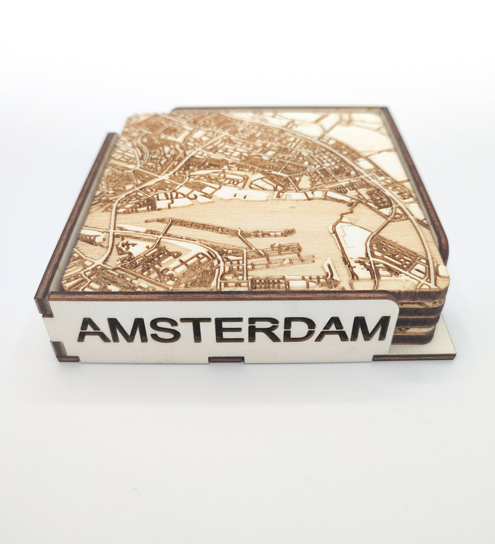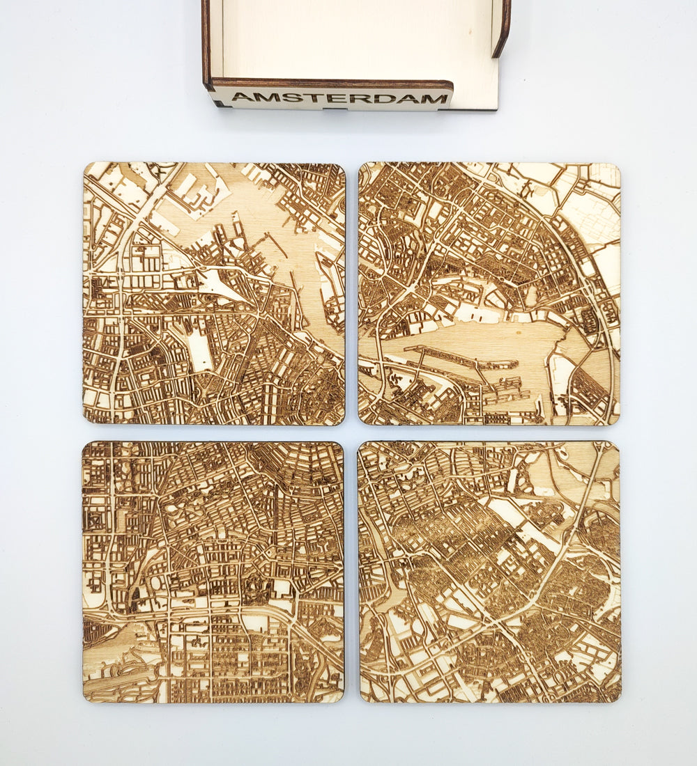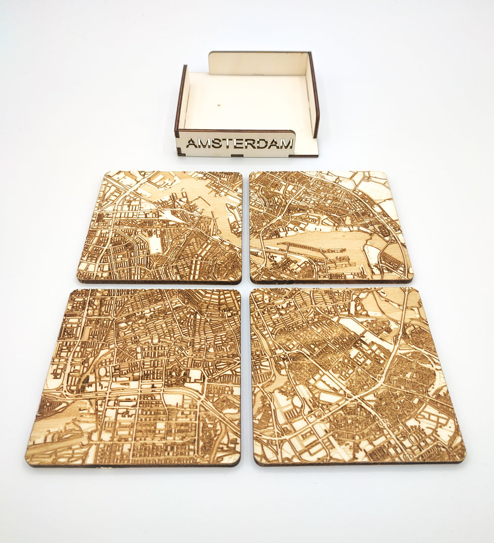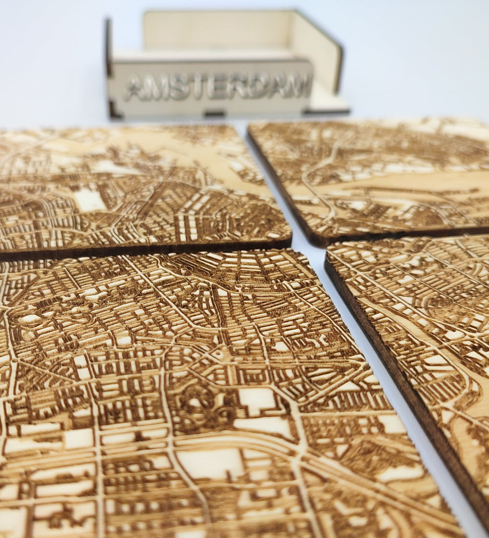 If you're looking for a unique way to decorate your table, these engraved wooden coasters are a great choice. Made of high quality wood, these coasters feature a beautifully engraved map of the city of Amsterdam in the Netherlands.