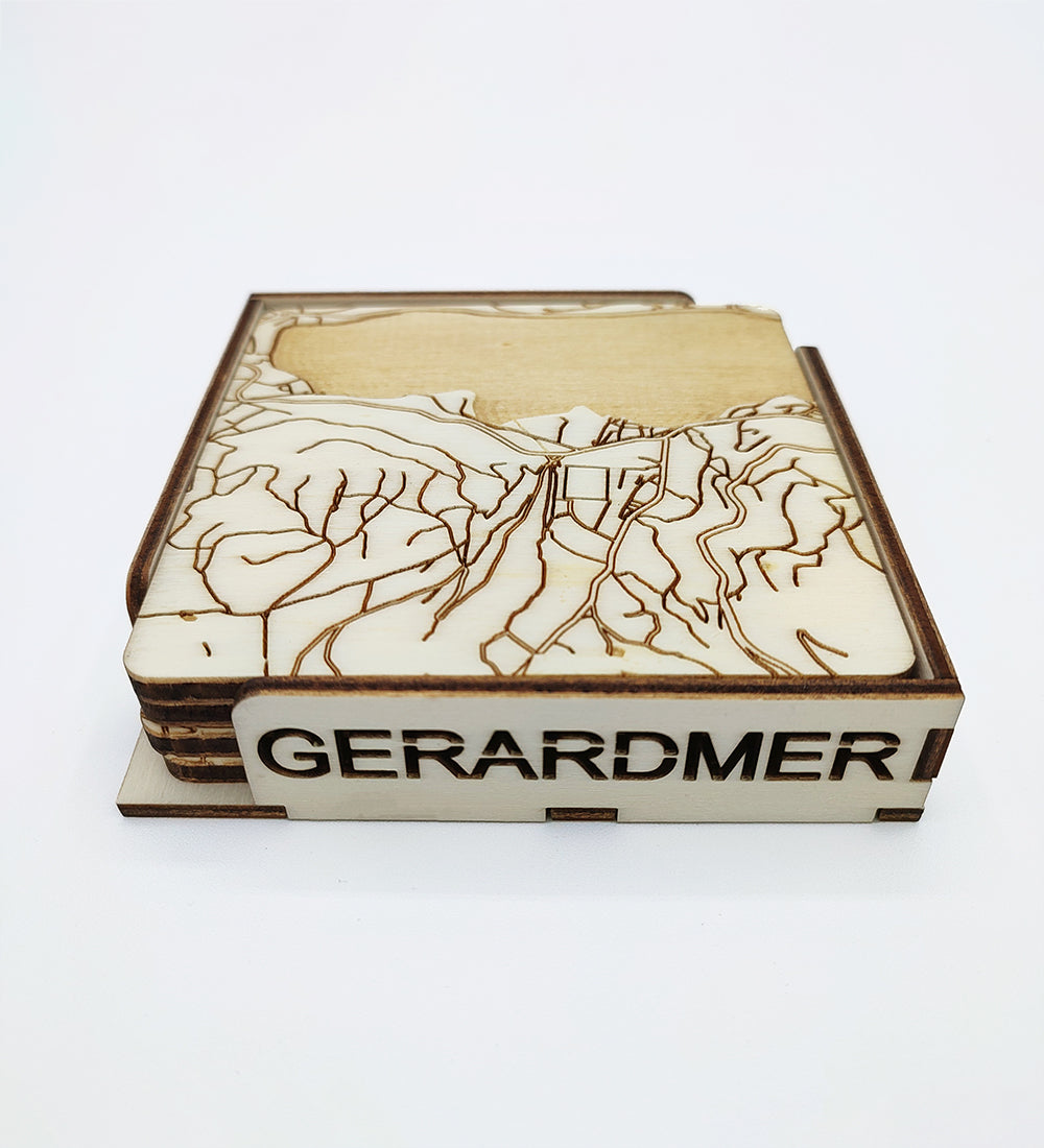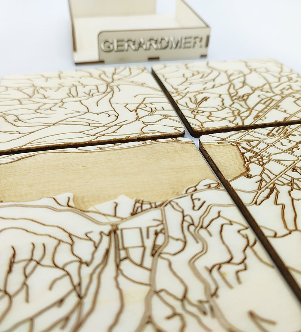 If you're looking for a unique way to decorate your table, these engraved wooden coasters are a great choice. Made of high quality wood, these coasters represent a magnificent engraved map of the town of Gérardmer in the Vosges.