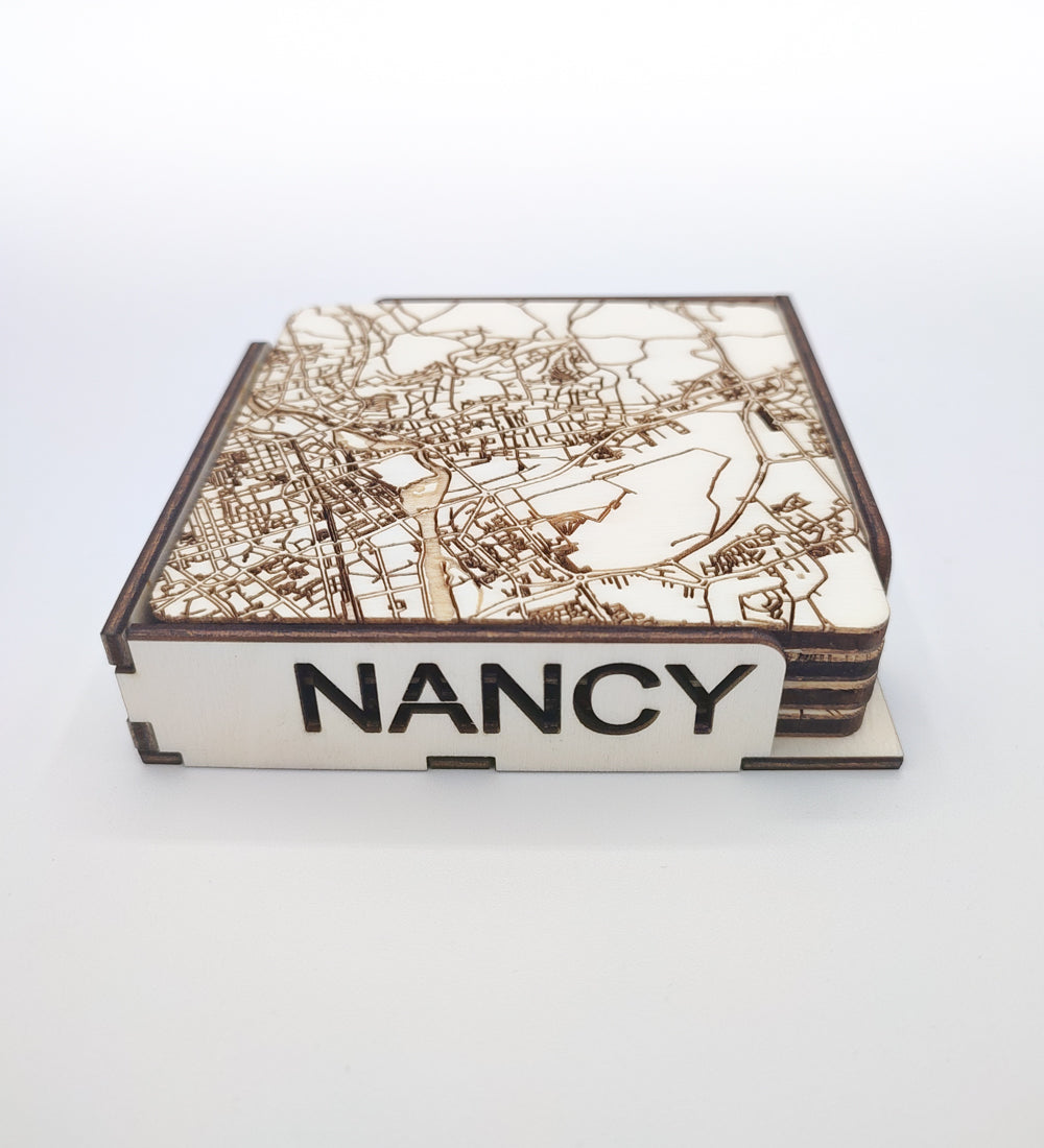 If you're looking for a unique way to decorate your table, these engraved wooden coasters are a great choice. Made of high quality wood, these coasters represent a magnificent engraved map of the city of Nancy in Meurthe-et-Moselle.