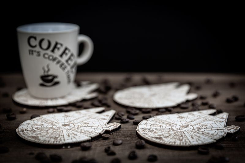 A set of several wooden coasters for Star Wars and Millennium Falcon fans. These wooden coasters are engraved with your favorite spaceship. Looking for gifts for Star Wars fans? These Millennium Falcon coasters are the best geek gifts. They are made of high quality, natural poplar wood. Add an upscale ambiance when you receive guests,