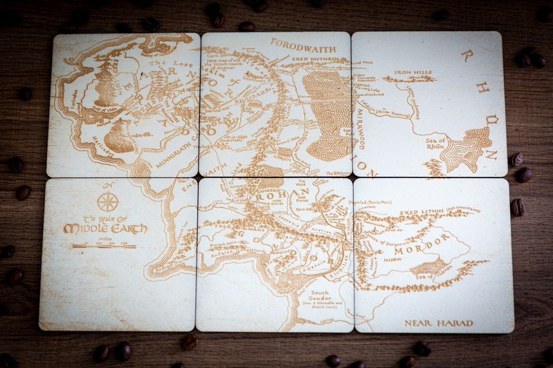 Discover this magnificent set of 6 Lord of the Rings coasters with the map of Middle-earth engraved on it. Perfect for fans of this epic saga, these high quality poplar wood coasters will bring an upscale vibe to your entertaining.