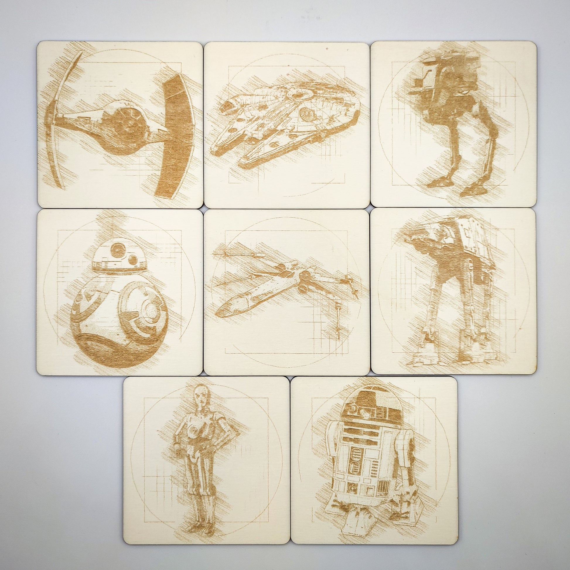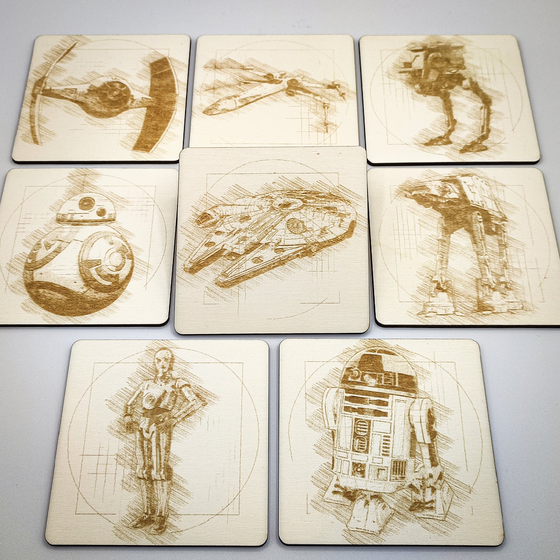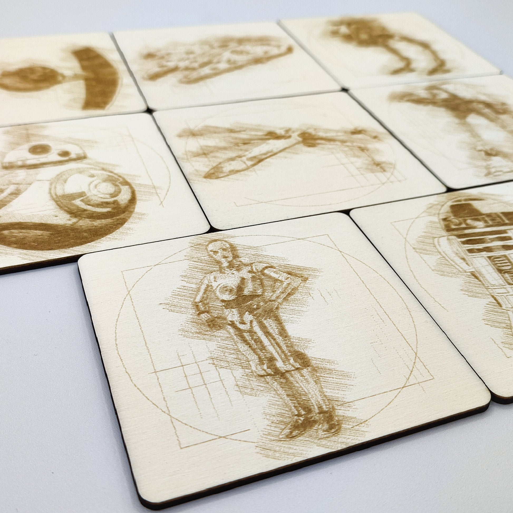Find in a most original version, the famous and emblematic characters and ships of Star Wars, R2D2, C3PO, BB8, Millennium Falcon, Tie Fighter, AT-ST, AT-AT and X-Wing. Designed in a Leonardo Da Vinci style, this set of 8 coasters is engraved and cut with great care.