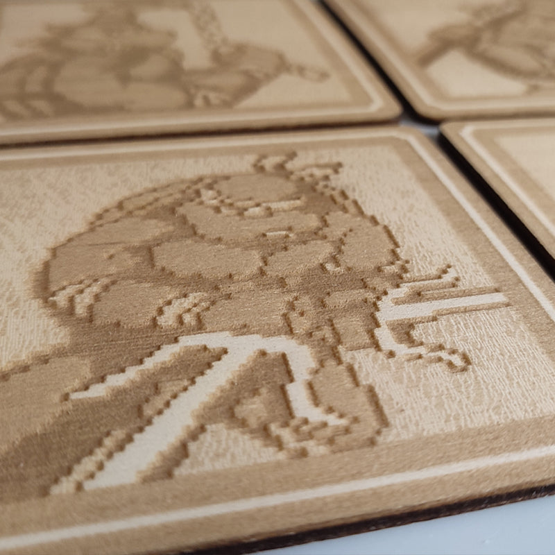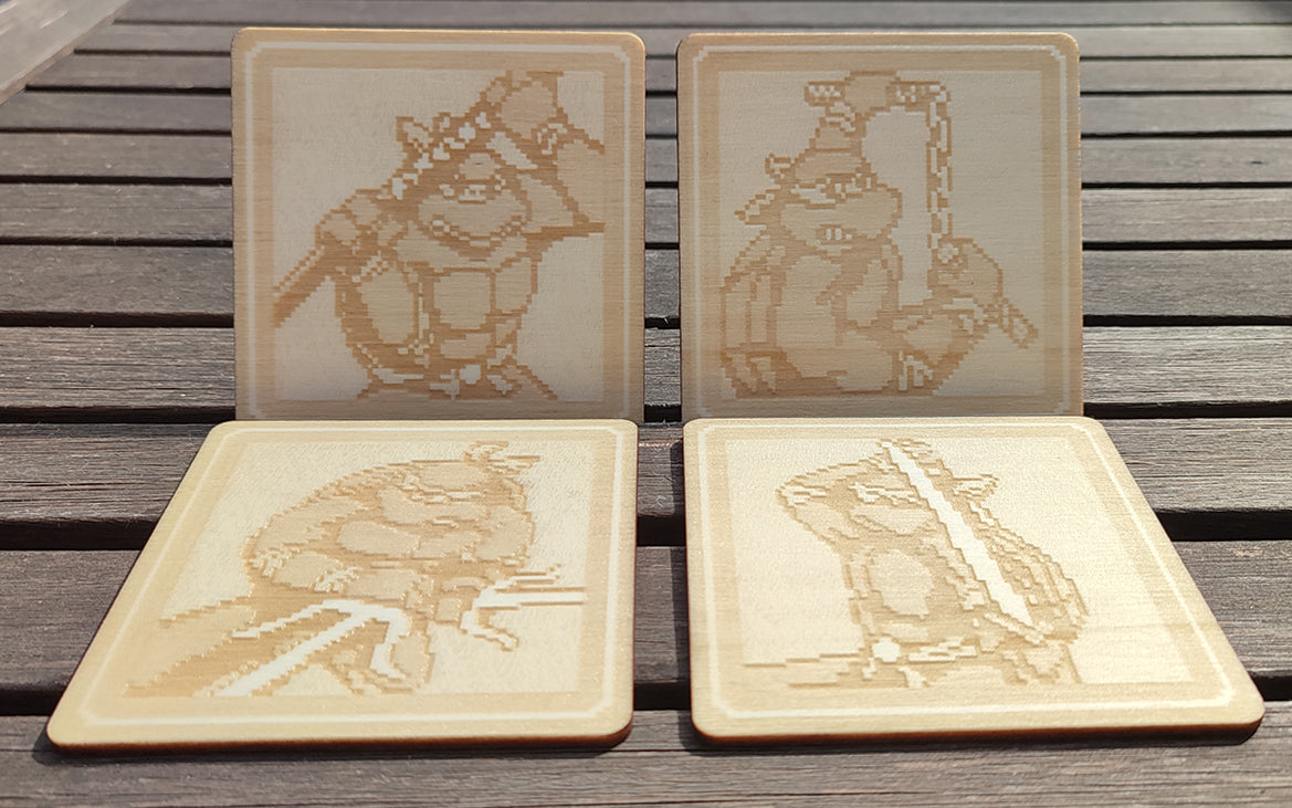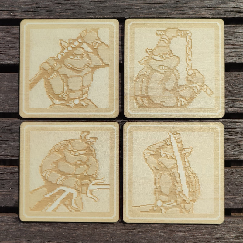 Retrouvez dans une version des plus originale, les quatre célèbres et emblématiques Tortues Ninja, Michelangelo, Donatello, Leonardo, and Raphael. Tirés de la version Snes de Teenage Mutant Ninja Turtle ce set de 4 sous verres est gravé et découpé avec le plus grand soin.