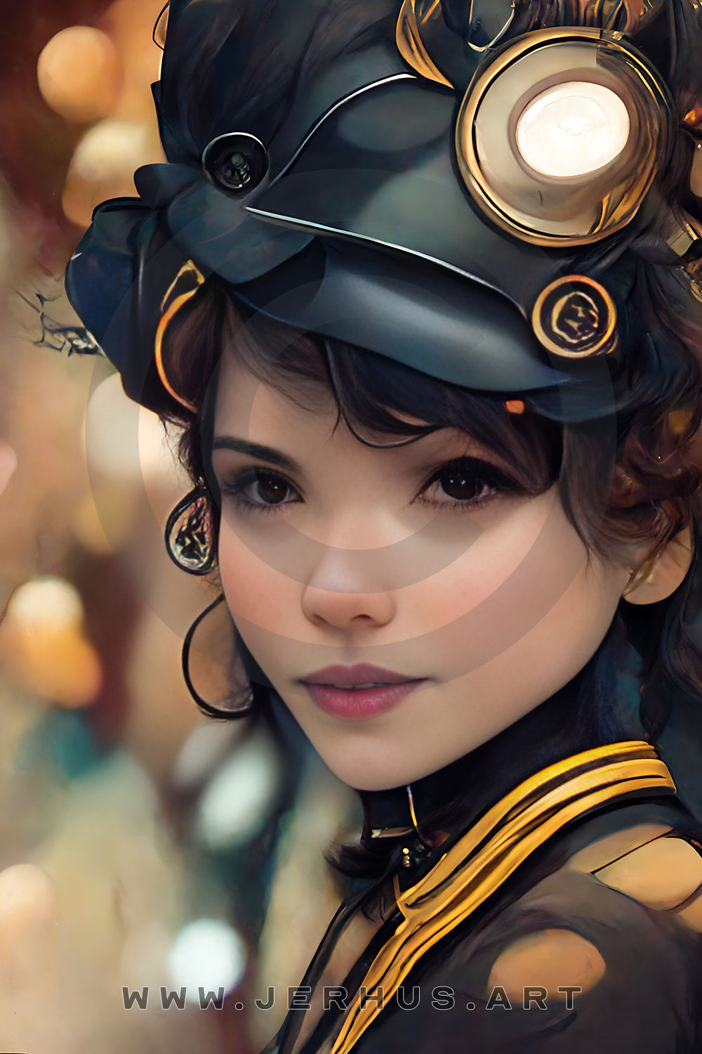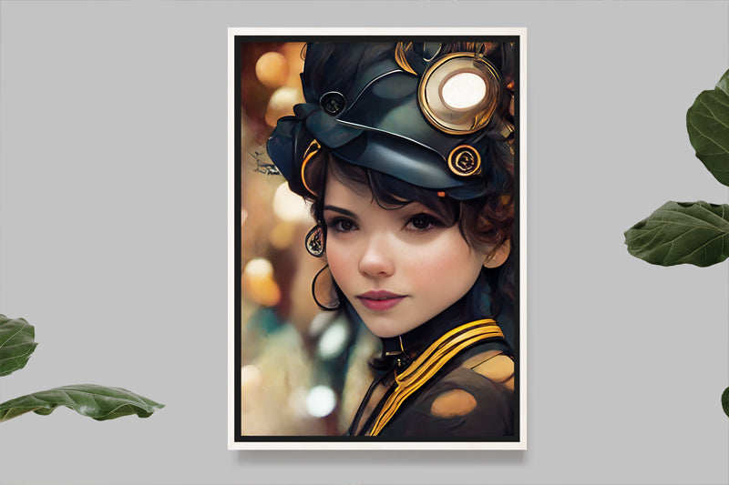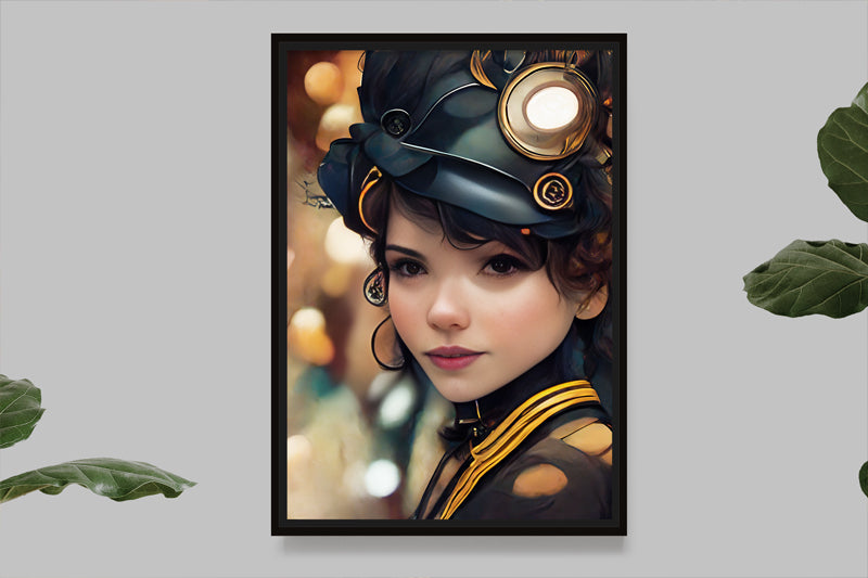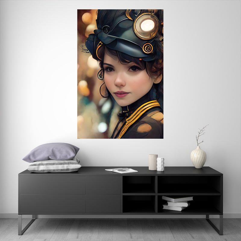 Here is an illustration that will immerse you in the Steampunk universe, that of the industrial revolution revisited with science fiction sauce. On paper, you'll discover a girl with a fascinating beauty and a strong personality, who proudly wears a steampunk outfit made of leather, metal and futuristic gadgets. She is surrounded by worked details, which reflect her taste for machines and advanced technology. This illustration will be perfect for decorating your interior, and will take you on a journey to a world where imagination rules. So don't hesitate any longer and let yourself be seduced by this steampunk girl, who will offer you a real moment of relaxation and escape.