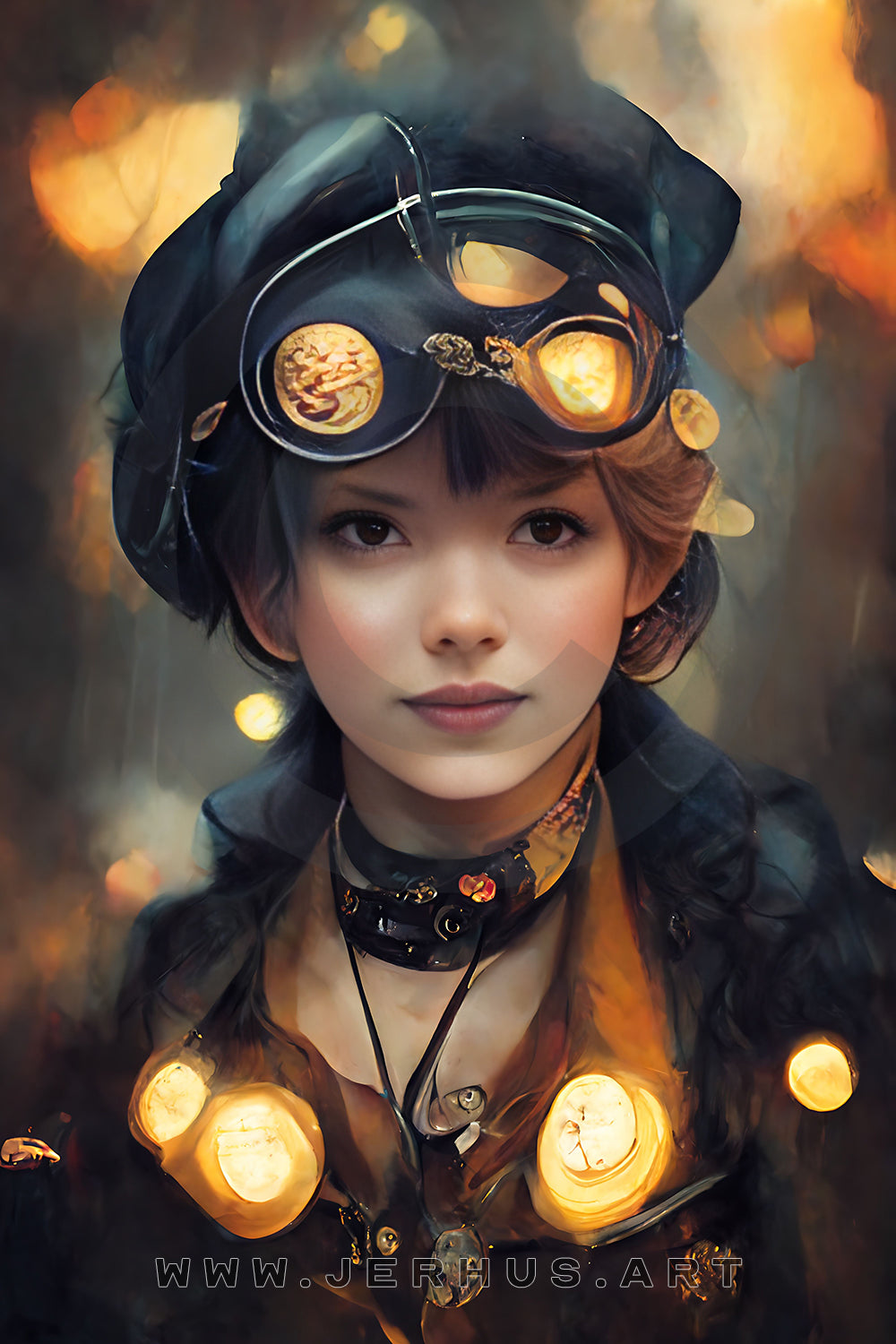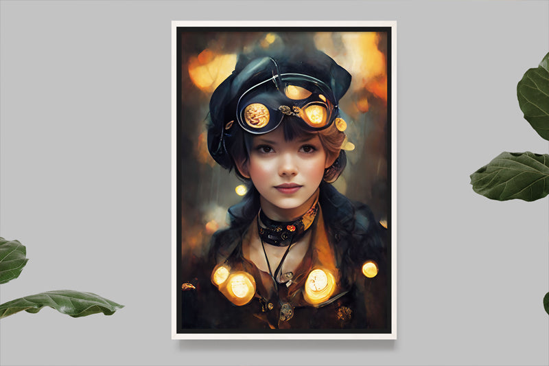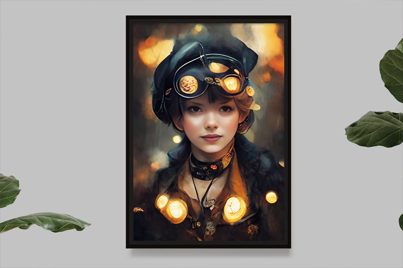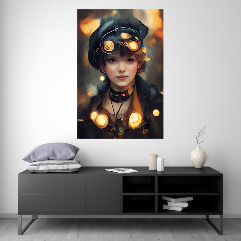 Here is an illustration that will immerse you in the Steampunk universe, that of the industrial revolution revisited with science fiction sauce. On paper, you'll discover a girl with a fascinating beauty and a strong personality, who proudly wears a steampunk outfit made of leather, metal and futuristic gadgets. She is surrounded by worked details, which reflect her taste for machines and advanced technology. This illustration will be perfect for decorating your interior, and will take you on a journey to a world where imagination rules. So don't hesitate any longer and let yourself be seduced by this steampunk girl, who will offer you a real moment of relaxation and escape.