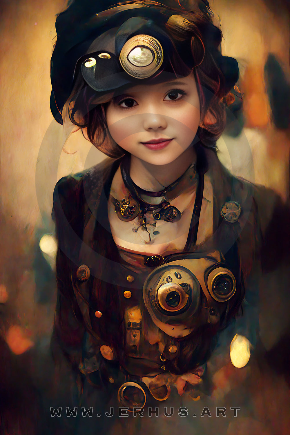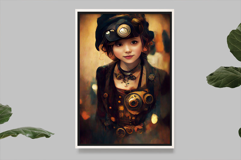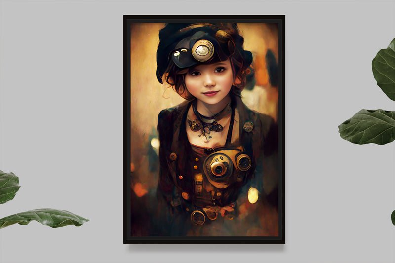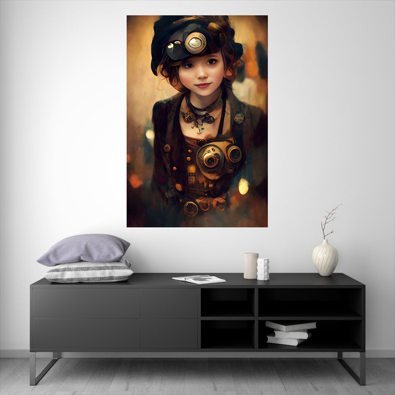 Here is an illustration that will immerse you in the Steampunk universe, that of the industrial revolution revisited with science fiction sauce. On paper, you'll discover a girl with a fascinating beauty and a strong personality, who proudly wears a steampunk outfit made of leather, metal and futuristic gadgets. She is surrounded by worked details, which reflect her taste for machines and advanced technology. This illustration will be perfect for decorating your interior, and will take you on a journey to a world where imagination rules. So don't hesitate any longer and let yourself be seduced by this steampunk girl, who will offer you a real moment of relaxation and escape.