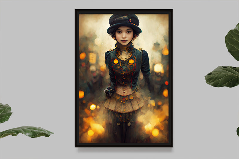 Here is an illustration that will immerse you in the Steampunk universe, that of the industrial revolution revisited with science fiction sauce. On paper, you'll discover a girl with a fascinating beauty and a strong personality, who proudly wears a steampunk outfit made of leather, metal and futuristic gadgets. She is surrounded by worked details, which reflect her taste for machines and advanced technology. This illustration will be perfect for decorating your interior, and will take you on a journey to a world where imagination rules. So don't hesitate any longer and let yourself be seduced by this steampunk girl, who will offer you a real moment of relaxation and escape.