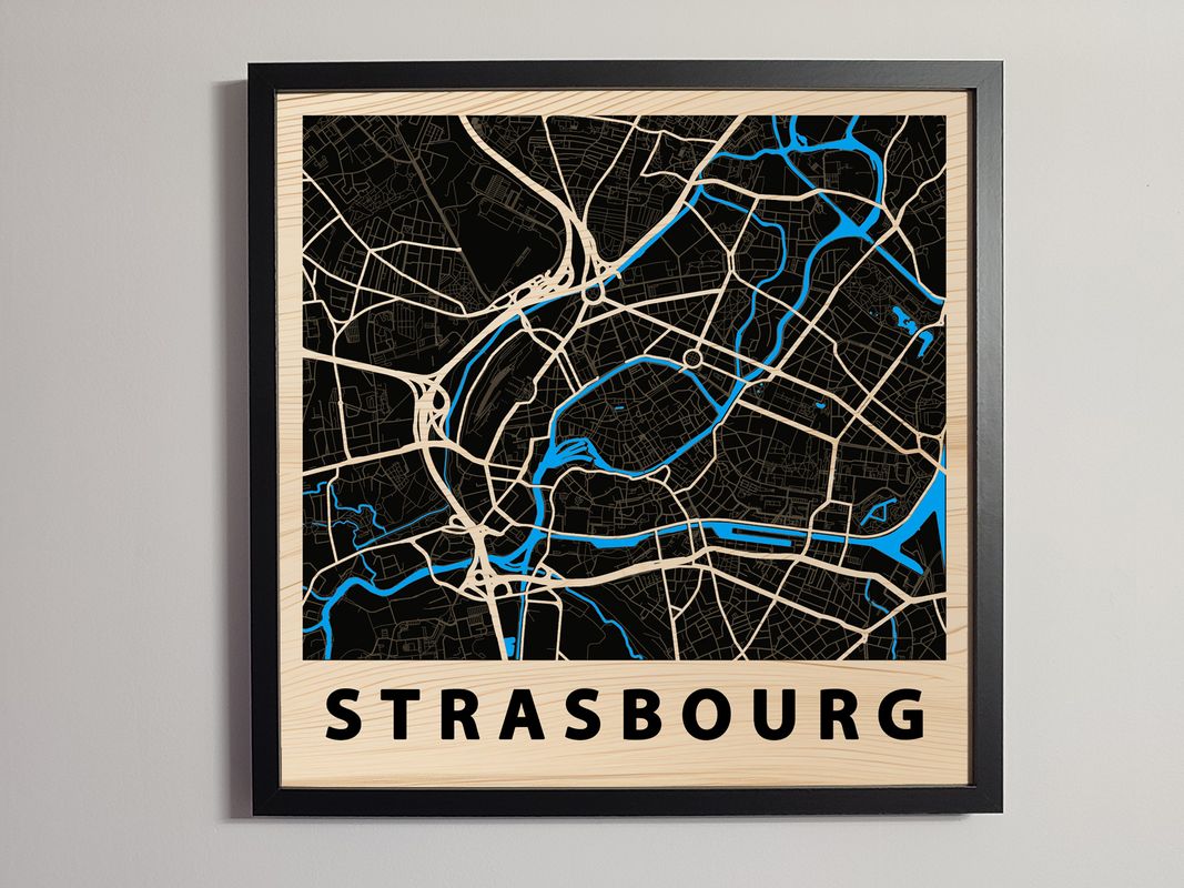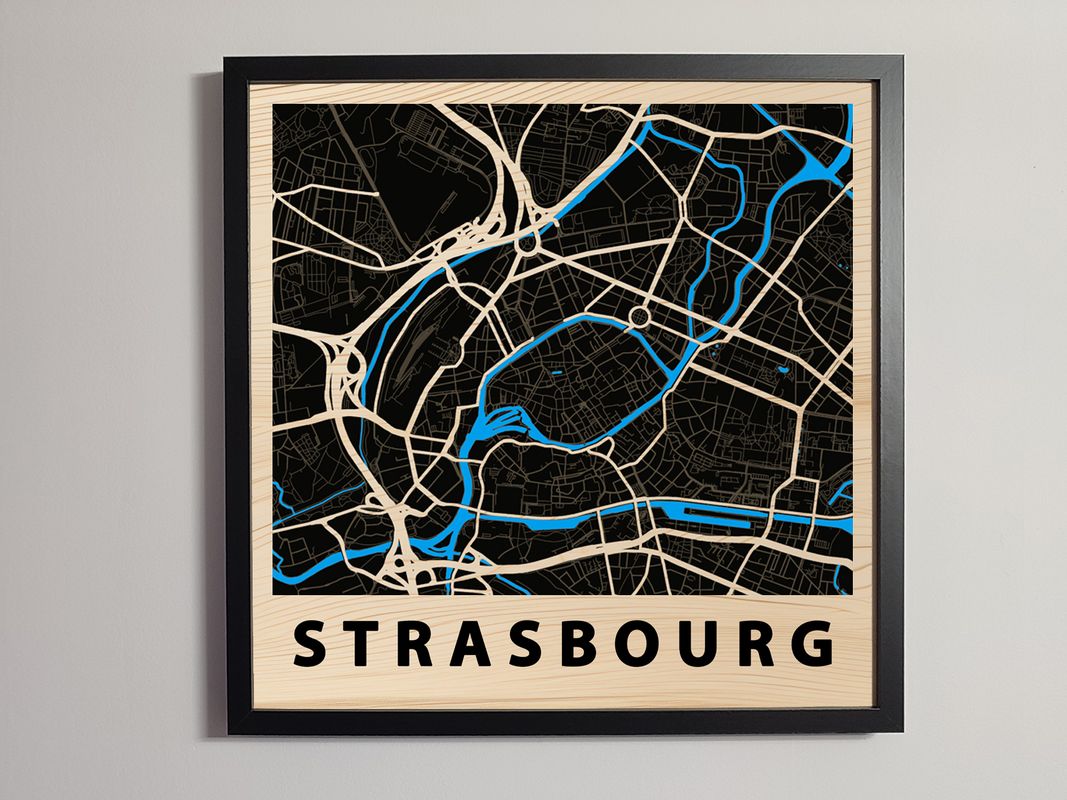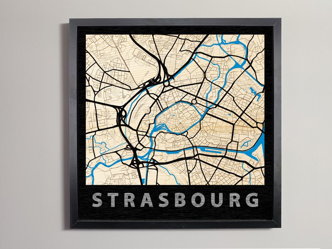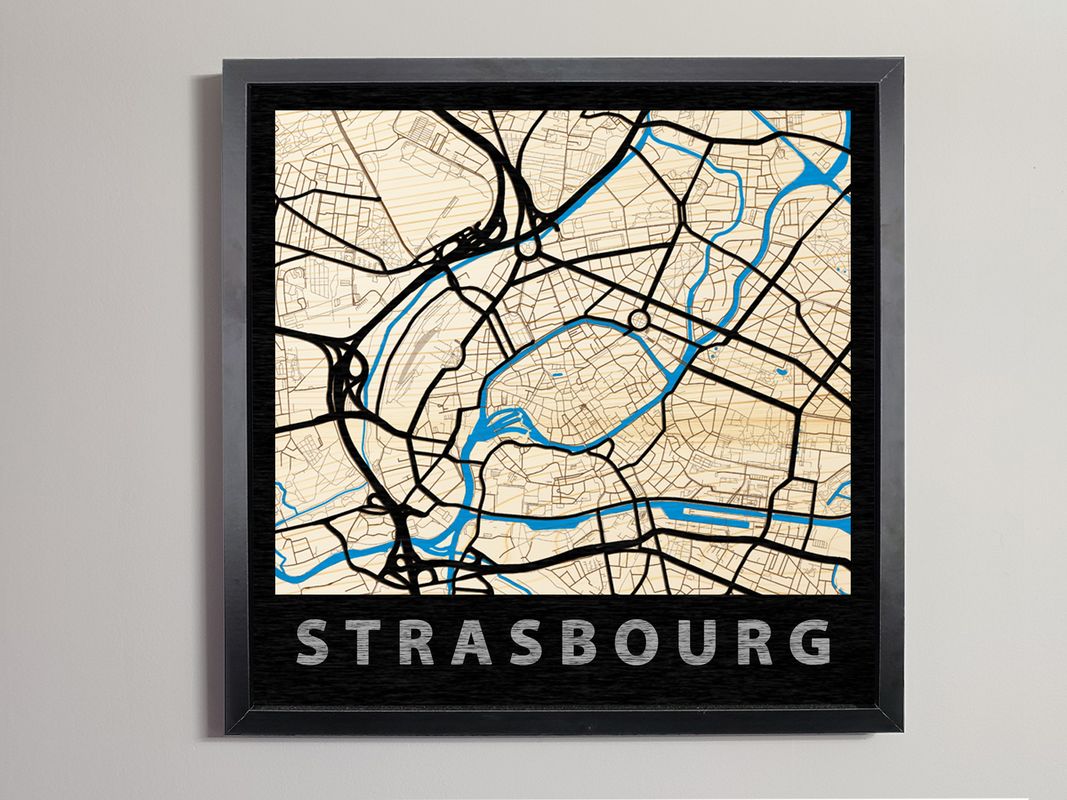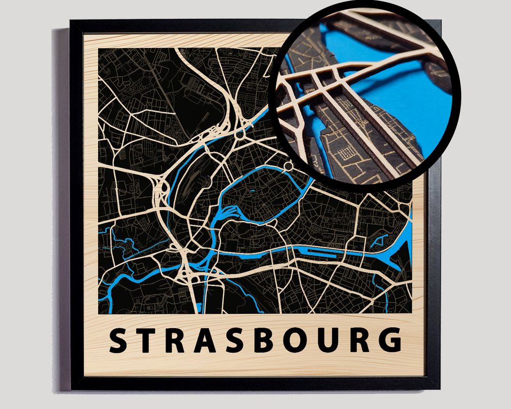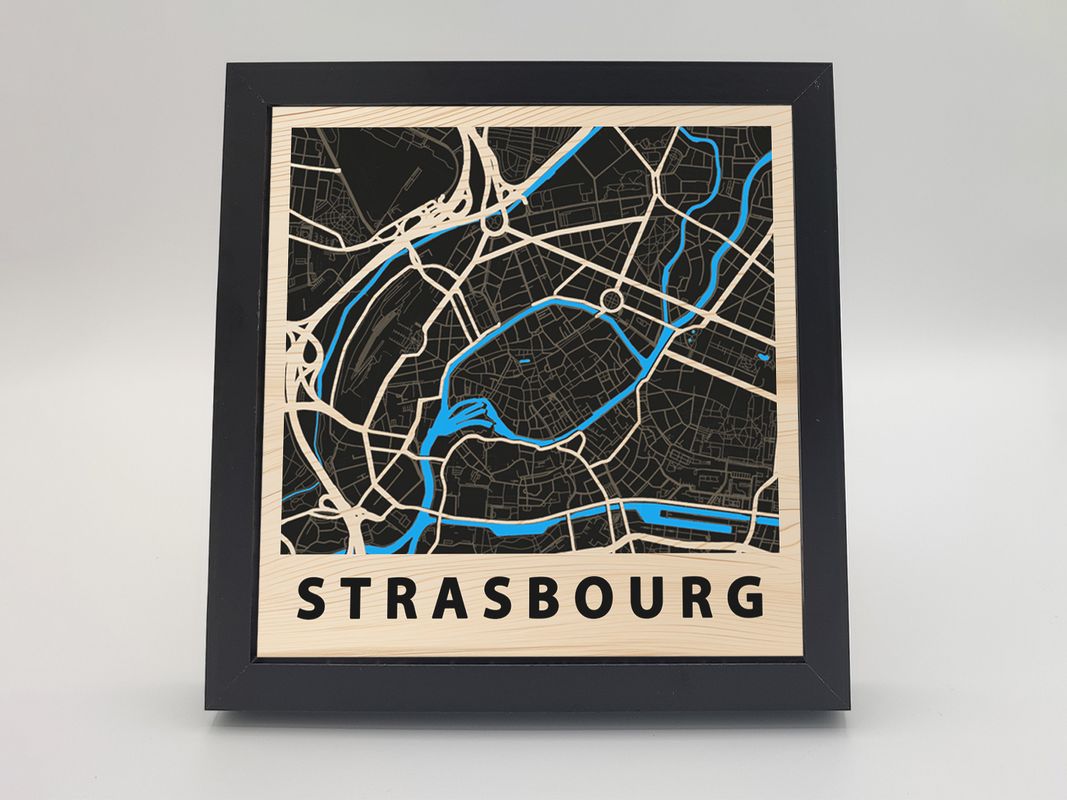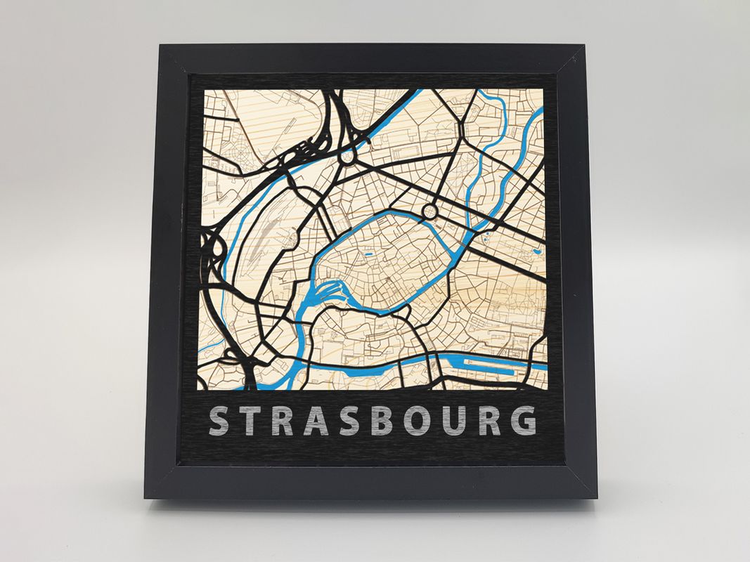 Cette délicate carte est façonnée avec soin à partir de trois couches de bois certifié FSC. Les routes principales de la ville sont minutieusement découpés sur la première couche, créant un contraste saisissant, tandis que les routes secondaires sont finement gravées sur la deuxième couche, ajoutant une dimension de détail exceptionnelle. Les cours d'eau sont joliment découpés, révélant une troisième couche peinte en bleu, offrant une représentation artistique et captivante de la ville de Strasbourg en France.