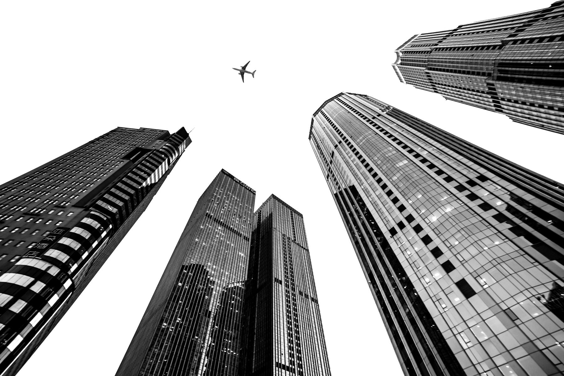 This captivating black and white photo shows four towering buildings seen from below, their concrete and glass structure silhouetted against the bright sky. The unusual and original perspective offers a unique look at these emblematic buildings of the city.