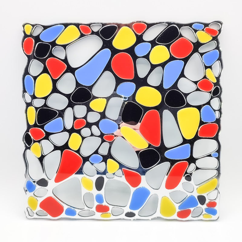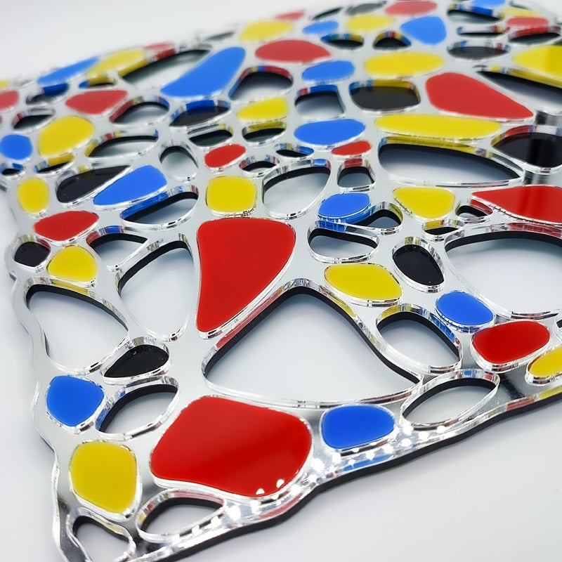 This apparent minimalism is subtly subverted by the introduction of the voronoi. These irregular shapes, inspired by natural geometry, spread from specific anchor points, delicately breaking the rigidity of the Mondrian grid. The voronoid cells are filled with bright primary colors - red, yellow, blue - true to Mondrian's signature aesthetic.
