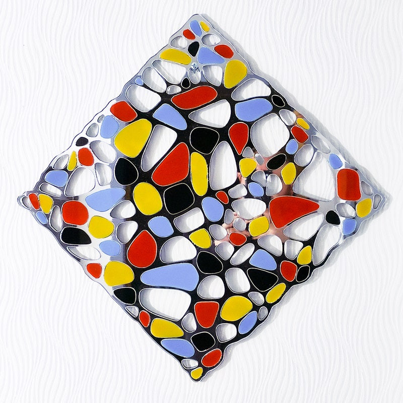 The artwork titled “Voronoi Nb II” brilliantly merges two distinct artistic universes: the colorimetric style of Piet Mondrian and the organic complexity of Voronoi diagrams. This square piece embodies a unique symbiosis between rigorous order and natural spontaneity.