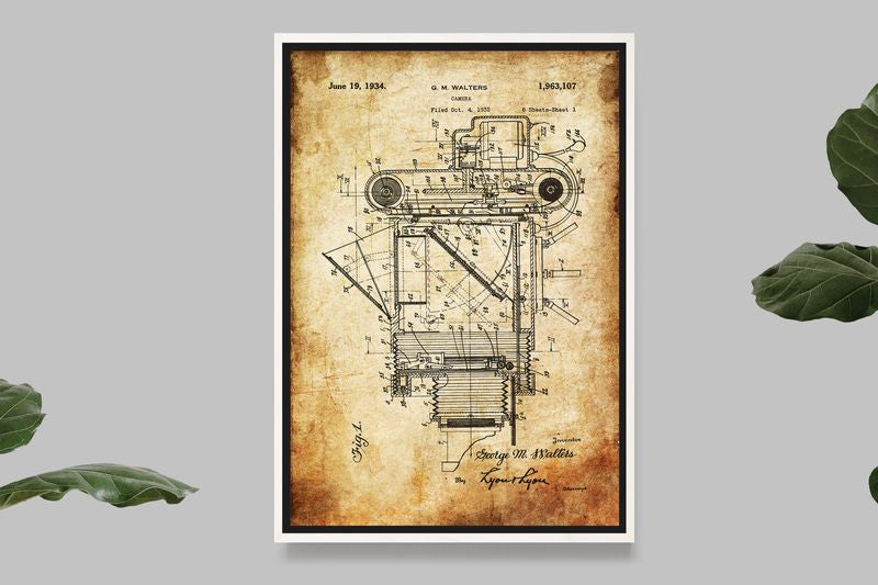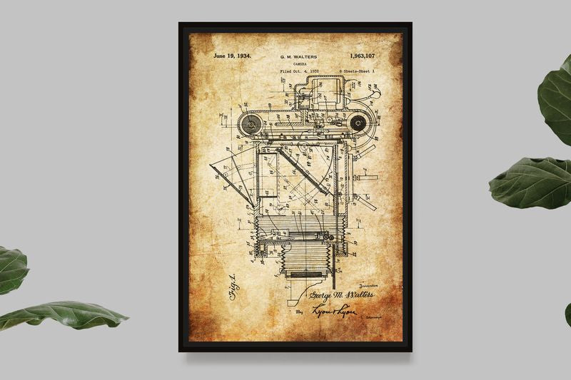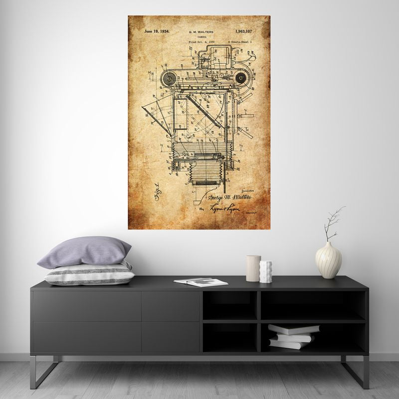 Voici une illustration unique et originale d'un appareil photo en style blueprint qui donne un aspect industriel et technique à l'image, parfait pour ajouter une touche de modernité à votre décoration intérieure.