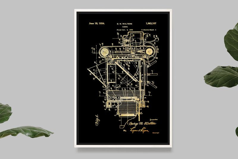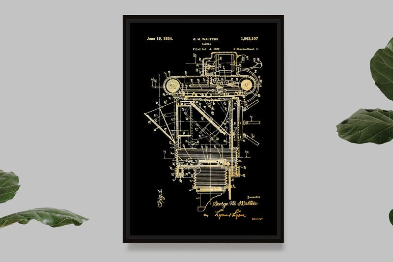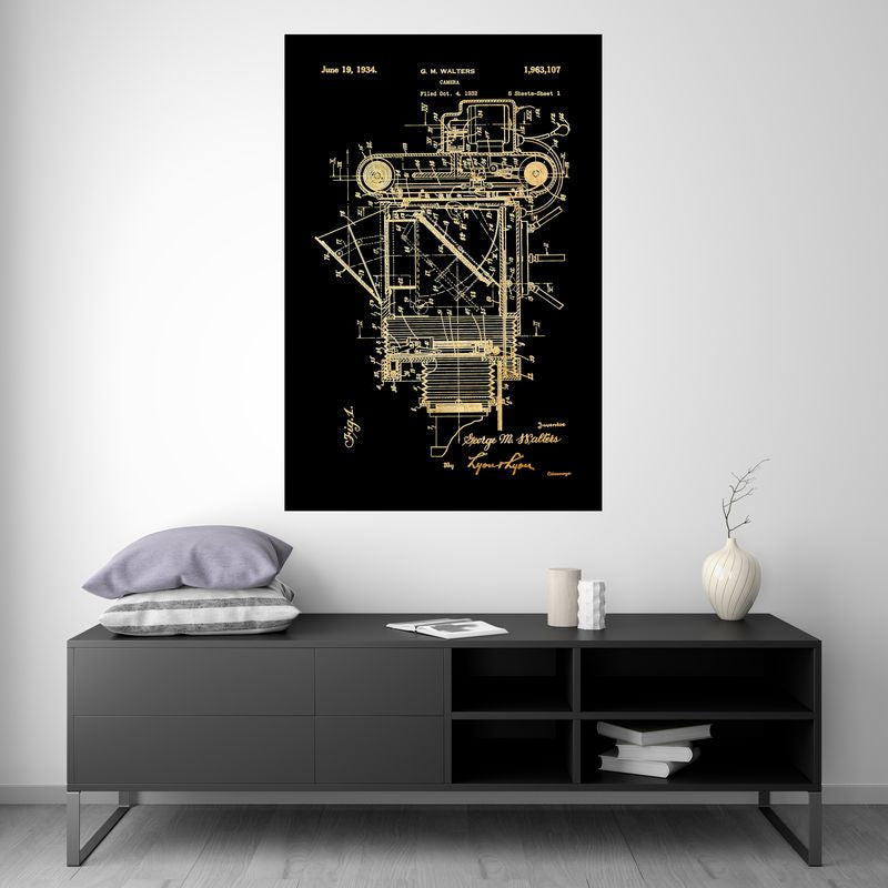 Voici une illustration unique et originale d'un appareil photo en couleur or sur fond noir. Ce style blueprint donne un aspect industriel et technique à l'image, parfait pour ajouter une touche de modernité à votre décoration intérieure.