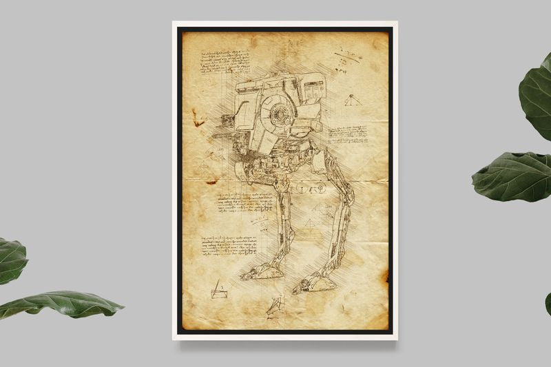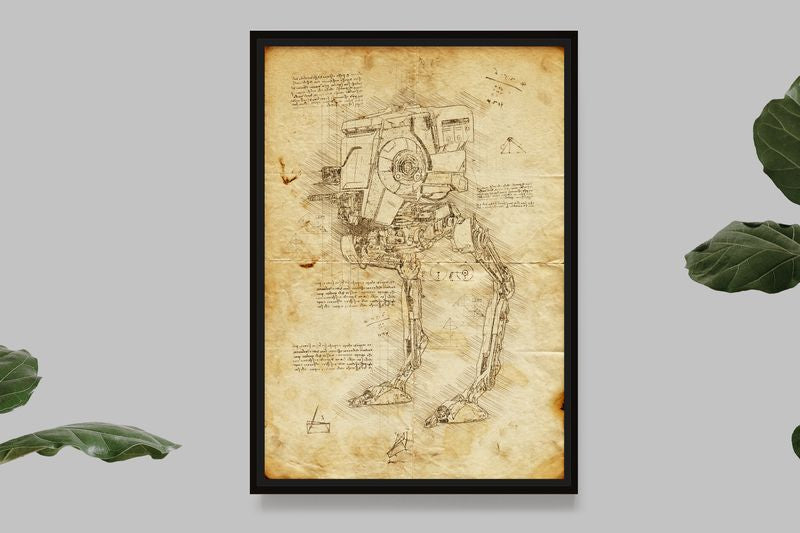 Cette illustration unique capture l'essence de l'AT-ST, un véhicule de combat utilisé par l'Empire Galactique dans la saga Star Wars. Le style de dessin, inspiré de Da Vinci, donne à l'image une touche de sophistication et de classicisme, tout en conservant le caractère imposant et redoutable de l'engin. Le dessin est réalisé avec soin et attention aux détails, mettant en valeur les lignes élégantes et les formes complexes de l'AT-ST.