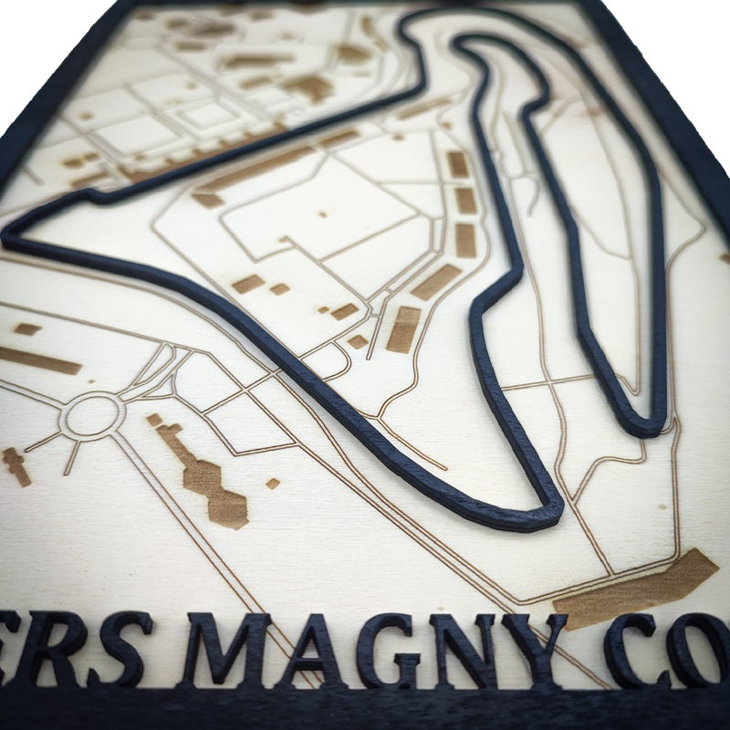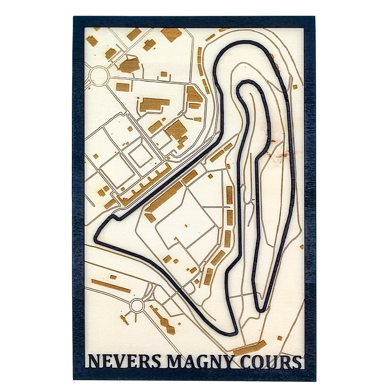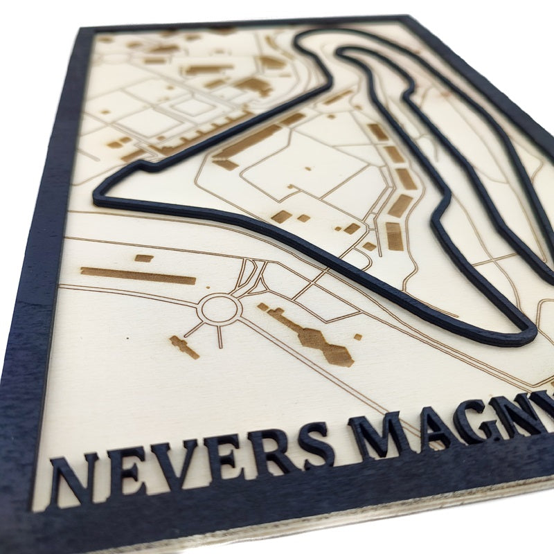 Retrouvez dans une version des plus originale, le célèbre circuit de Nevers Magny-Cours, situé en France. La carte en bois en 3D multicouches unique et artistique de votre circuit de course français préféré. La piste de course et le cadre sont peint en noir à la main.