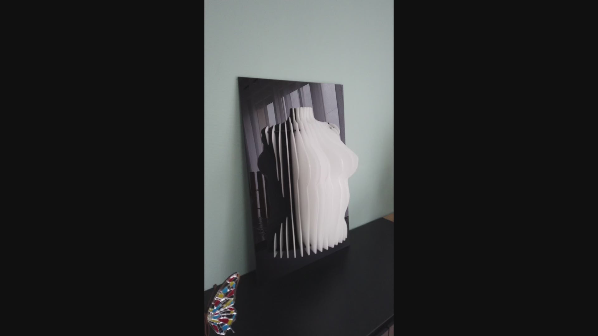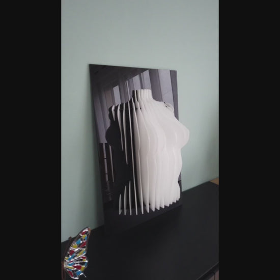 Ajoutez une touche d’originalité à votre intérieur avec cette sculpture murale en relief, une œuvre d’art contemporaine qui joue avec les courbes féminine et les contrastes saisissants entre le blanc et le noir. Chaque élément est découpé et assemblé à la main pour créer un effet de profondeur hypnotique.