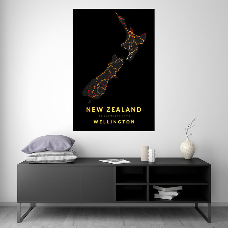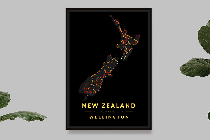 Cette carte vintage de la Nouvelle Zélande met en valeur les routes spectaculaires du pays. Les couleurs de la carte, qui se caractérisent par des tons de orange, de rouge et de jaune, rappellent les cartes anciennes.
