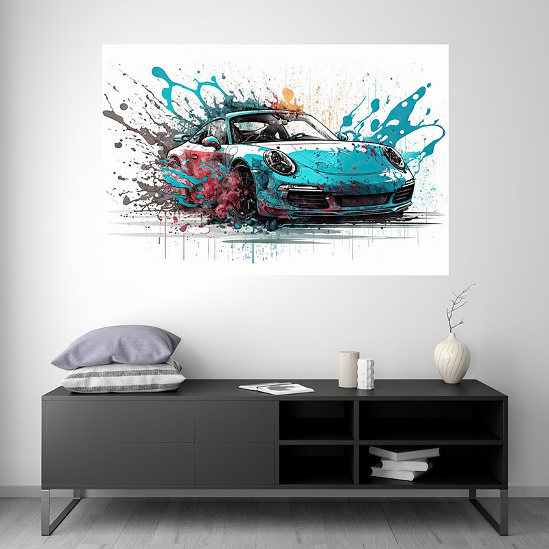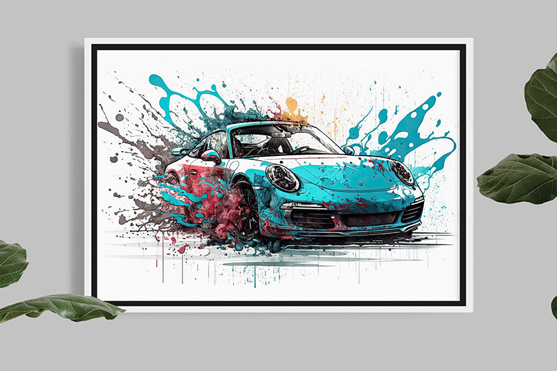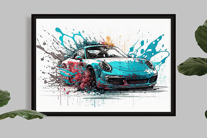 Cette illustration de la Porsche 911 Targa GTS est un véritable chef-d'œuvre de l'art de l'automobile, mettant en valeur le design emblématique et intemporel de cette voiture de sport légendaire grâce à la technique de splash painting.