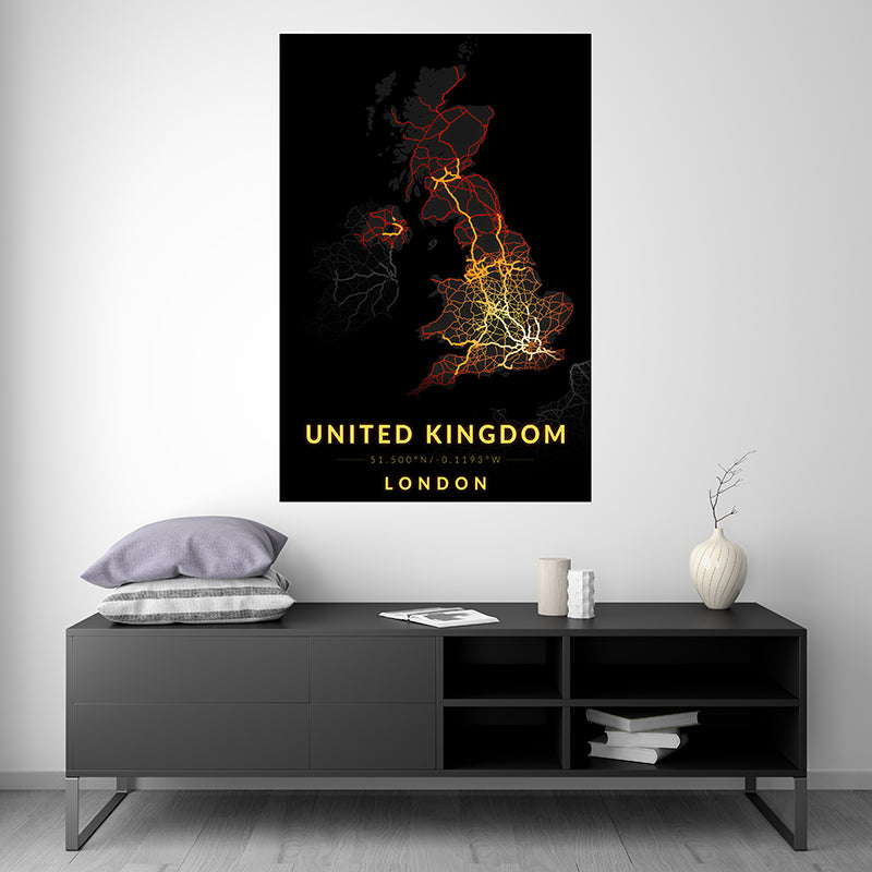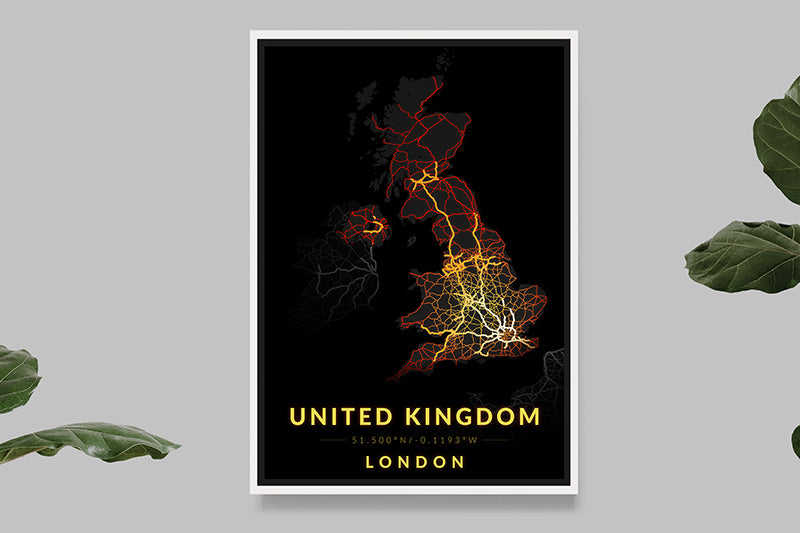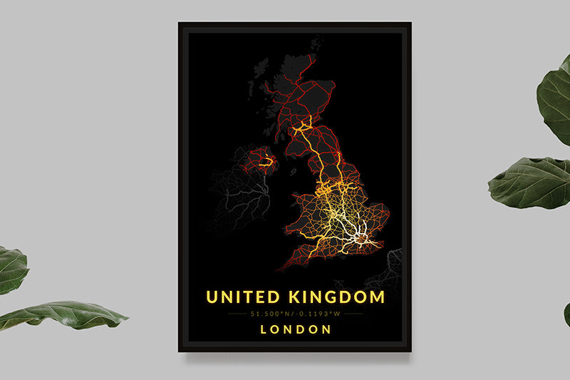 Cette carte vintage du Royaume-Uni met en valeur les routes spectaculaires du pays. Les couleurs de la carte, qui se caractérisent par des tons de orange, de rouge et de jaune, rappellent les cartes anciennes.
